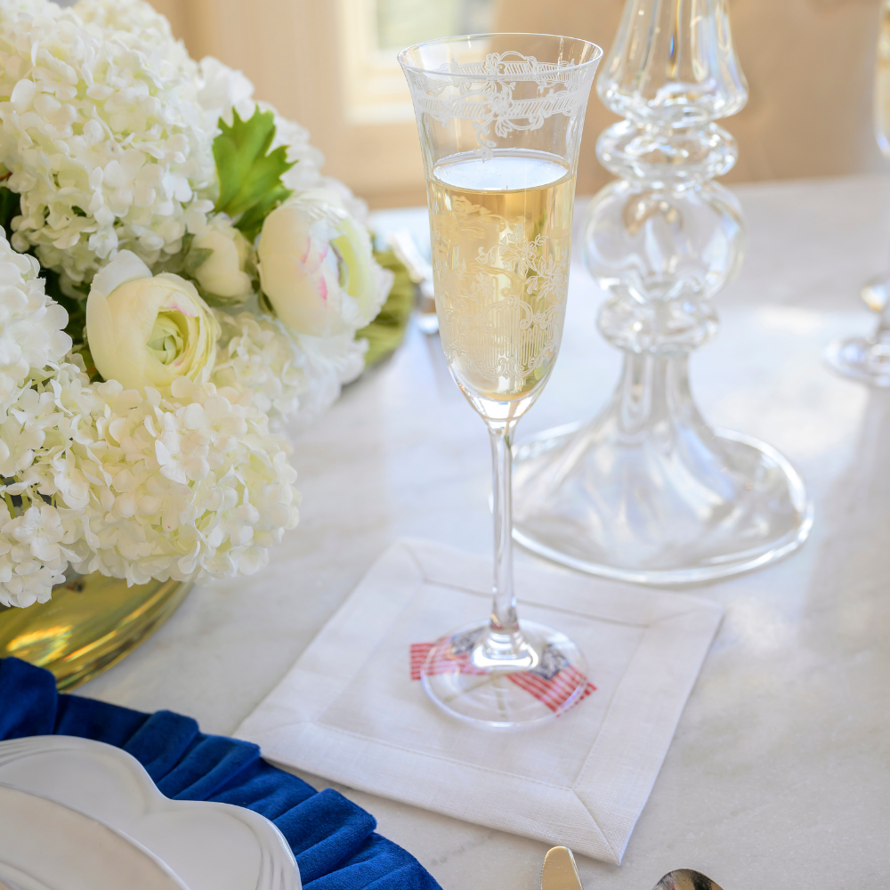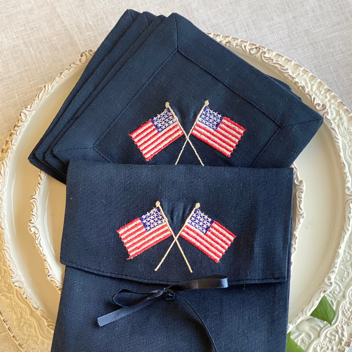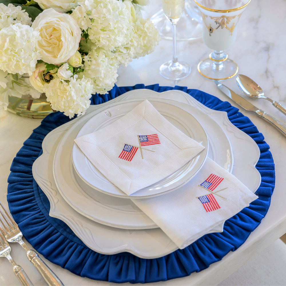 Enhance your decor with this elegant set of four 6" x 6" cocktail napkins. Crafted from 100% linen and embroidered with American Flags, they bring patriotic charm to Memorial Day, the Fourth of July, and beyond. Presented in a linen pouch, this elegant set is perfect for adding sophistication to your home or gifting with style.