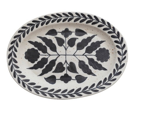 This matte black and cream speckled stoneware platter is ideal for entertaining. It is adorned with a modern floral design and classic border. Its spacious size is also dishwasher safe.