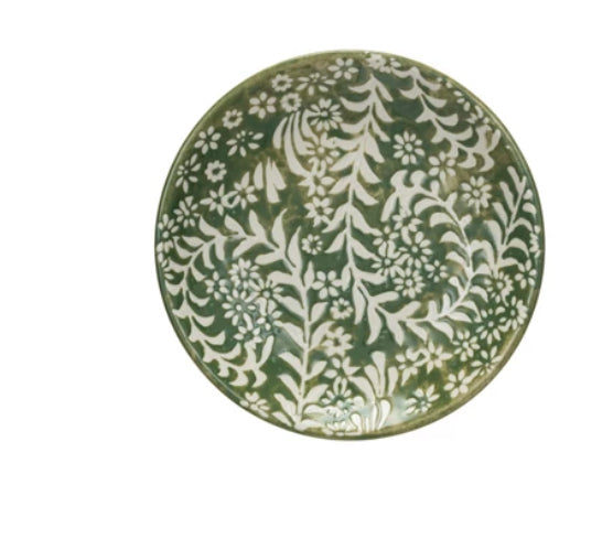 These wax relief plates feature a combination of green and black floral designs; all textural and perfect for a bold neutral on the table.