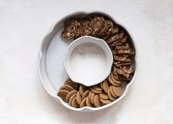 13-3/4" Round x 3"H Stoneware Ring-Shaped Serving Dish, reactive glaze, white. Its organic shape is absolutely stunning, making it ideal for showcasing cookies, crackers, or chips alongside a dip bowl.