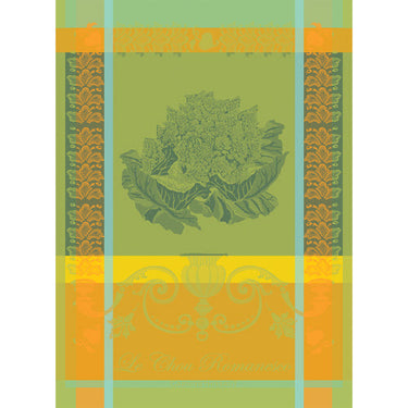 Indulge in the verdant beauty of the leafy, Romanesco broccoli that is sure to make a statement with your Le Chou Romanesco Vert Kitchen Towel in shades of green, yellow, and orange. This woven design was crafted from original artwork, hand-drawn by our in-house team of textile artisans & designers in France. Constructed on jacquard looms with extra long staple cotton, Garnier Thiebaut USA's jacquard kitchen towels are woven for longevity, and can last for generations with the proper washing maintenance and use.