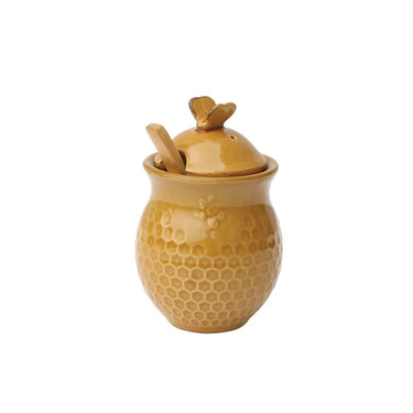 Honey should be served in this yellow stoneware container. It has a wood dipper and the lid has an opening to allow the dipper to stay inside keeping your table and counters clean. It is microwave safe making warming up the honey a breeze.