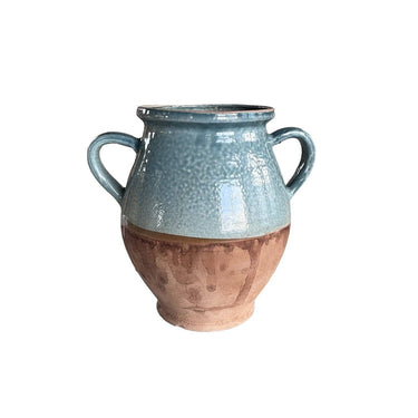 Our Cottage Crafted collection is a Mediterranean-inspired pottery selection. The classic two-handle pottery jug is 10 inches tall and features a color-blocking style with a colorfully glazed upper portion and a natural-hued base.