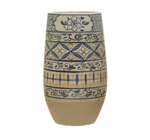 Substantial, hand-painted vase in an array of shades including cream, blue, and yellow. Floral and geometric prints come together for a subtle and beautiful transitional style. Perfect for dried or fresh flowers, this vase is ideal paired with black iron, wood, or brass candle holders.