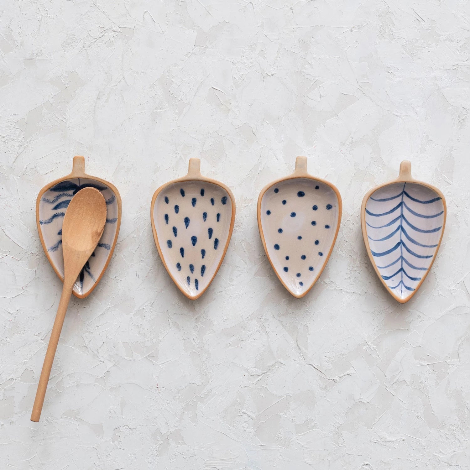 This cottage-inspired set of stoneware dishes showcases the silhouette of a leaf with 4 styles of intricately hand-painted designs. Perfect "Catch all" dish for fine jewelry, a spoon rest, or to hold assorted snacks and condiments.