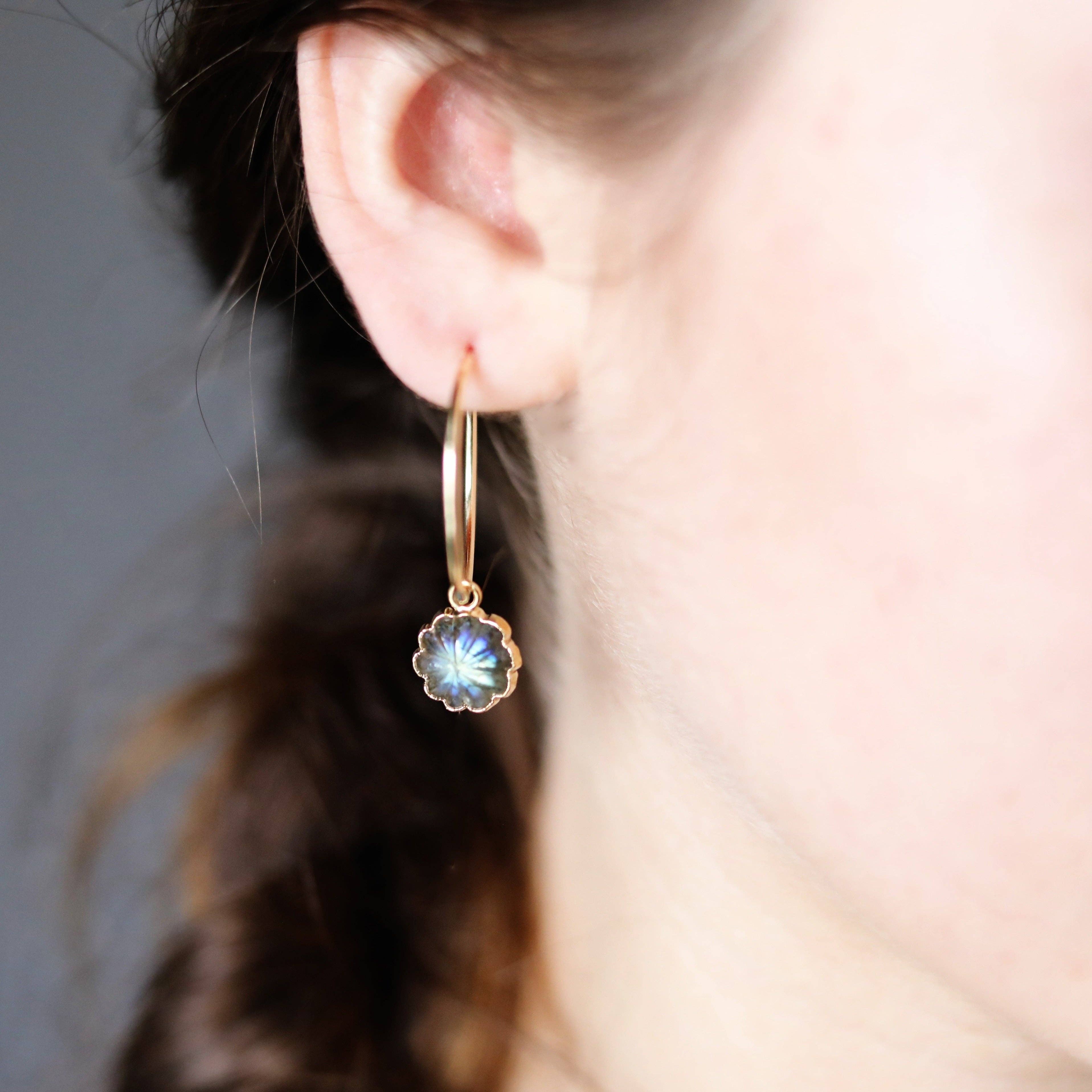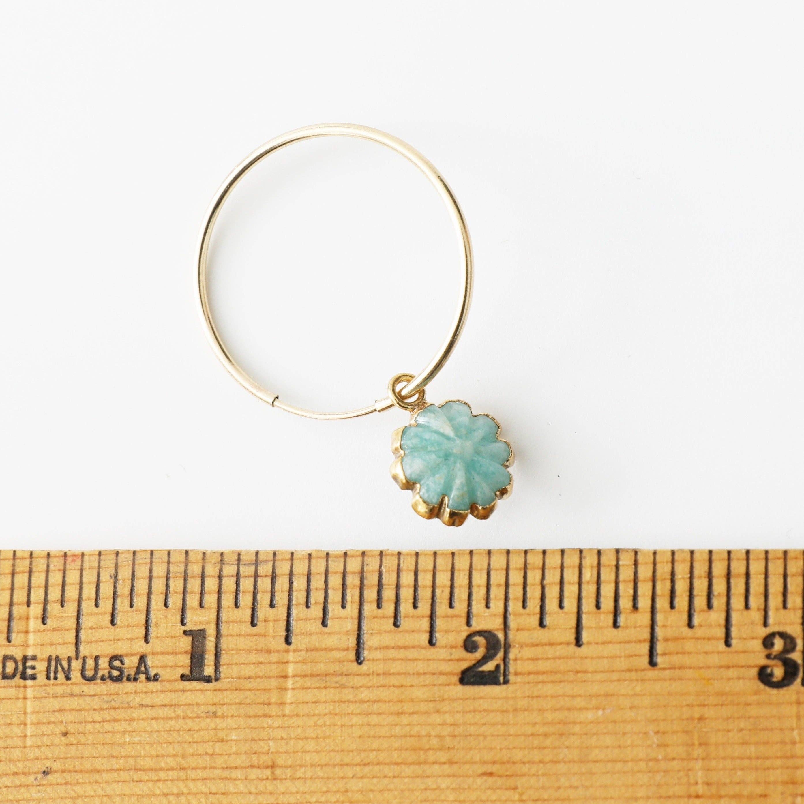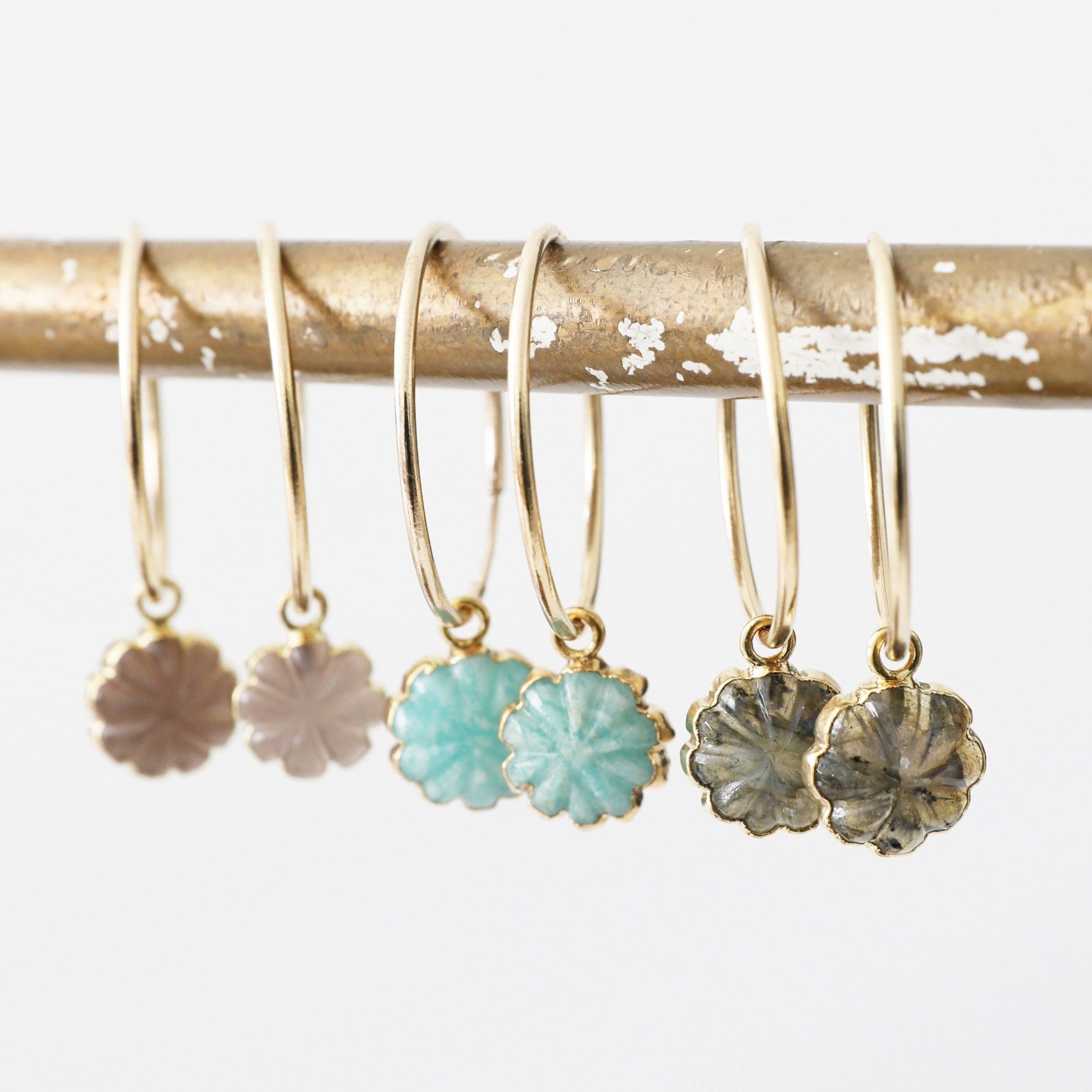 These 14kt gold fill Bloom Hoop Earrings add a touch of cheerful energy to your look. The earrings boast a lovely gemstone flower charm that hangs gracefully from the gold fill hoop, available in a variety of stone options.