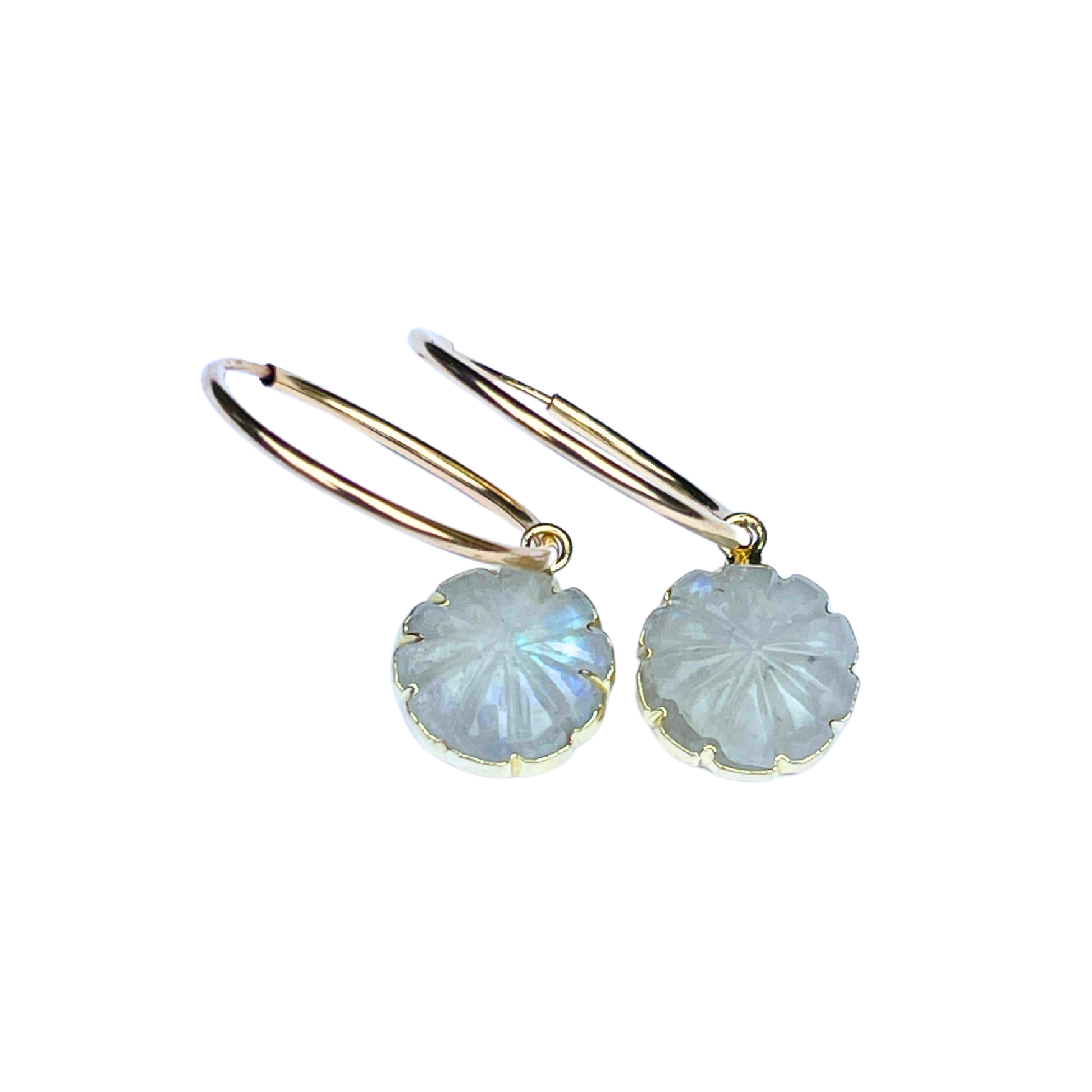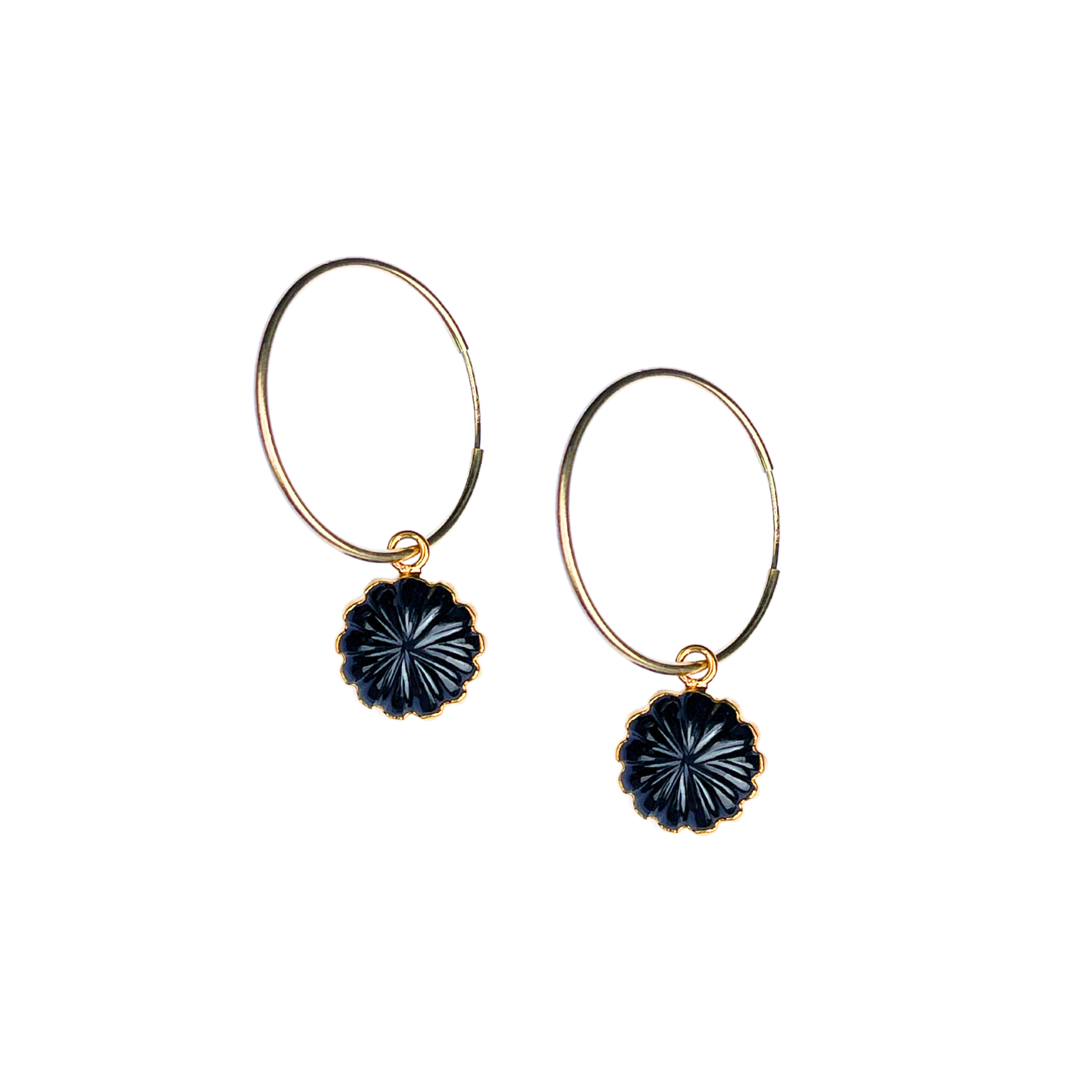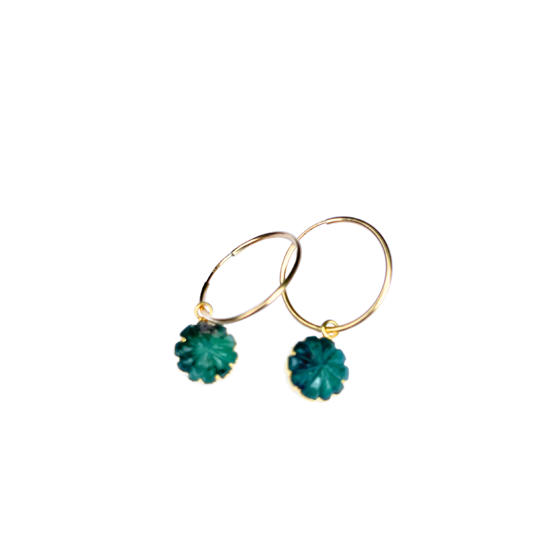 These 14kt gold fill Bloom Hoop Earrings add a touch of cheerful energy to your look. The earrings boast a lovely gemstone flower charm that hangs gracefully from the gold fill hoop, available in a variety of stone options.