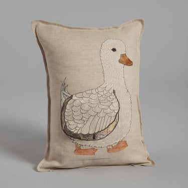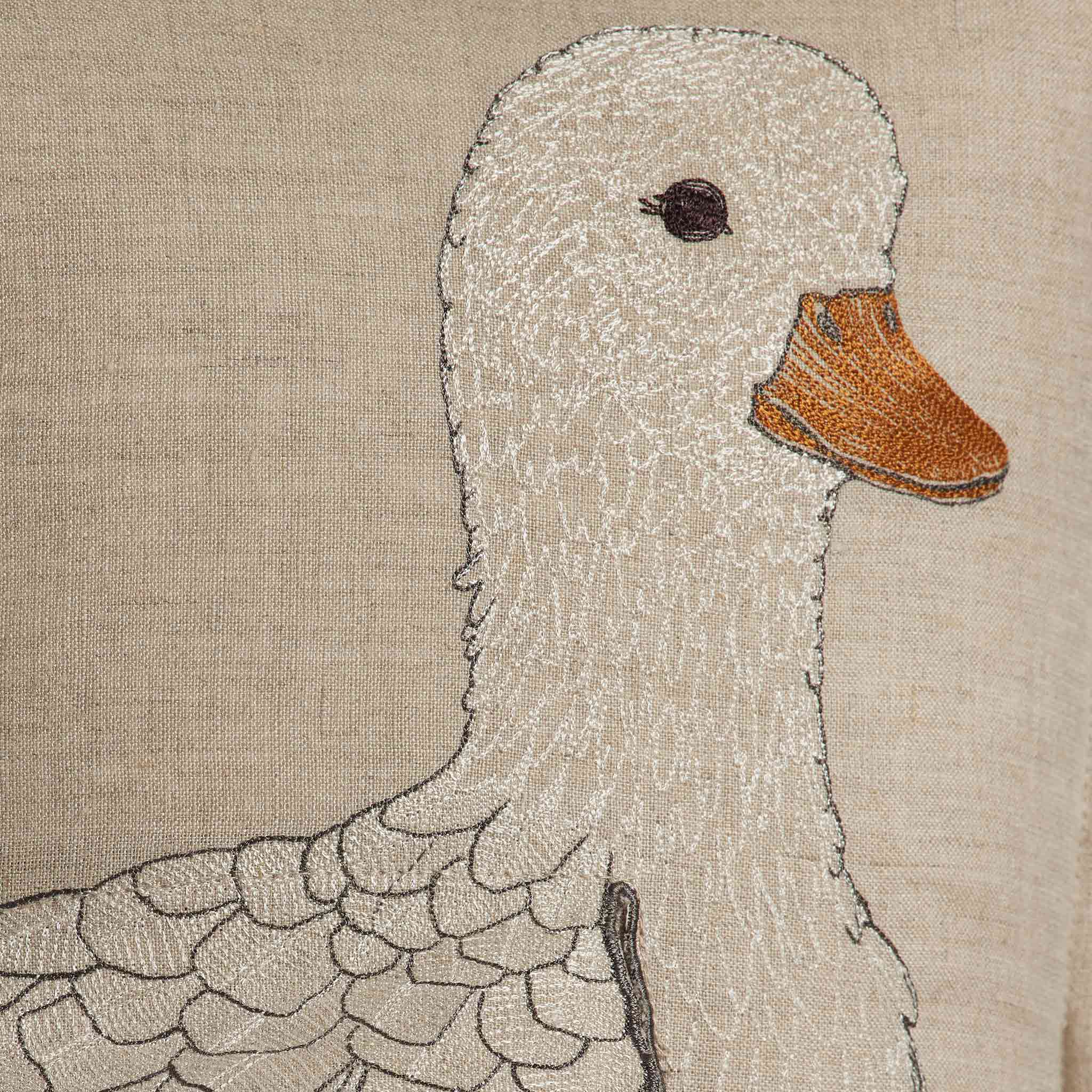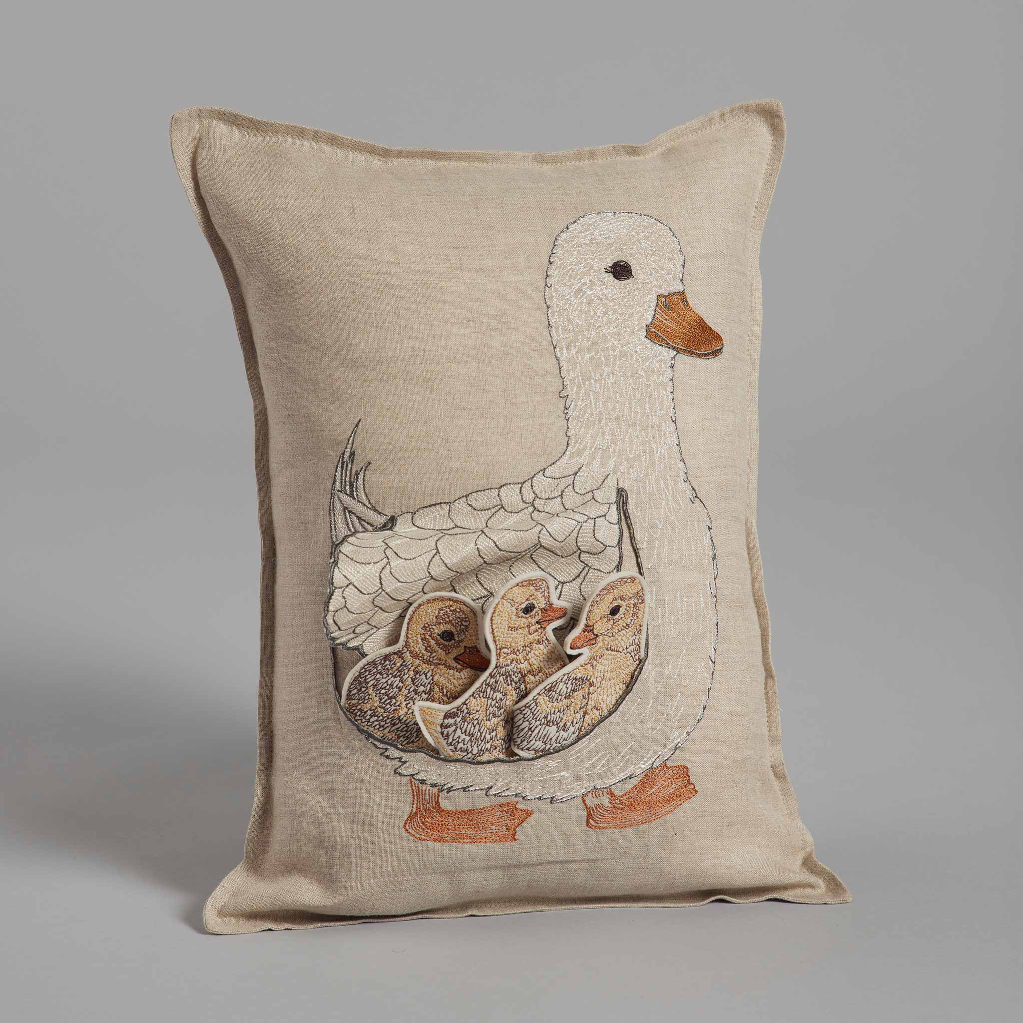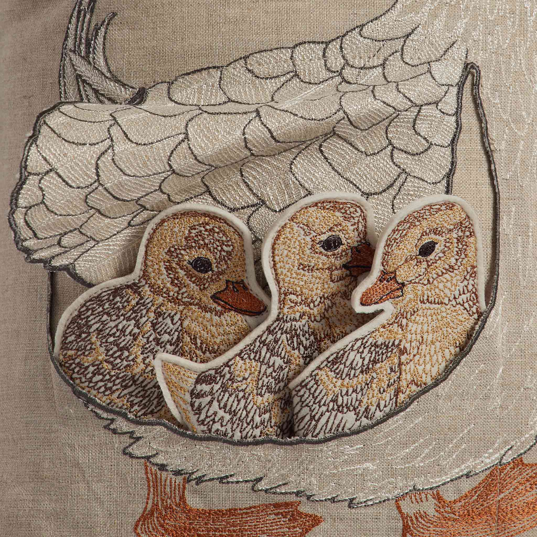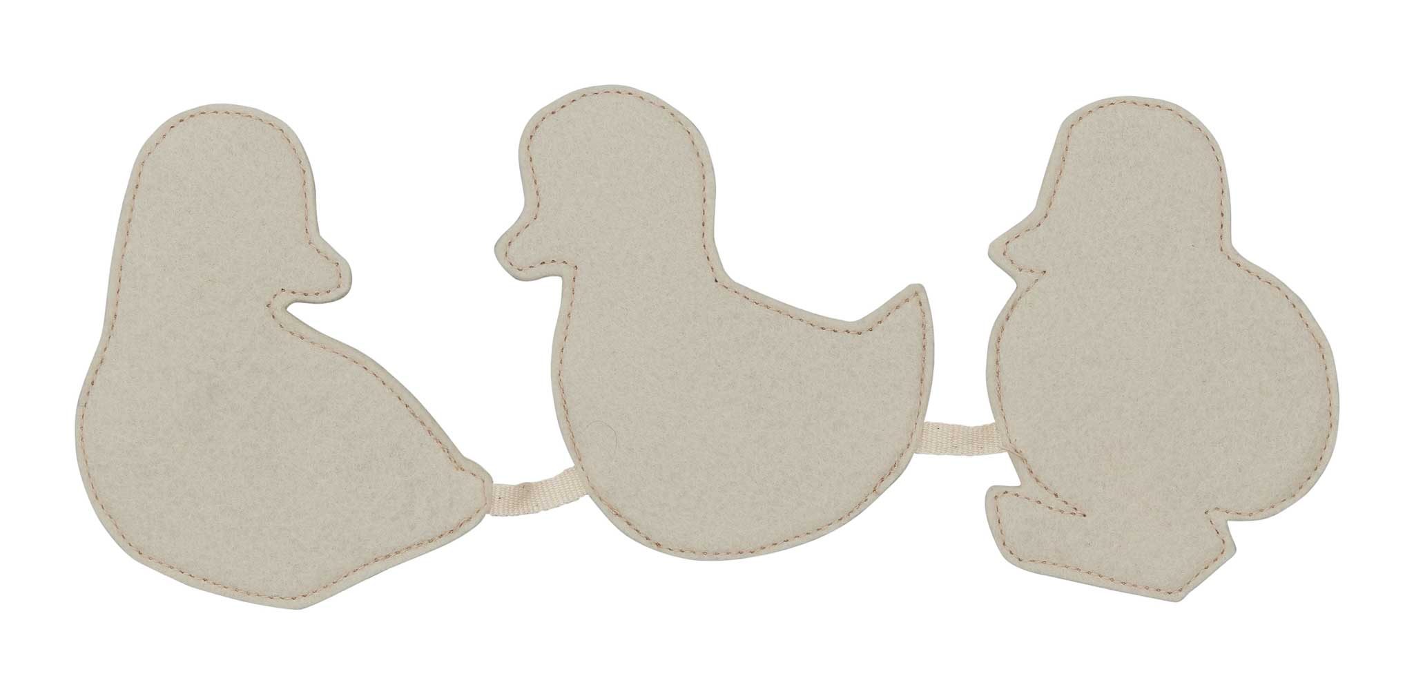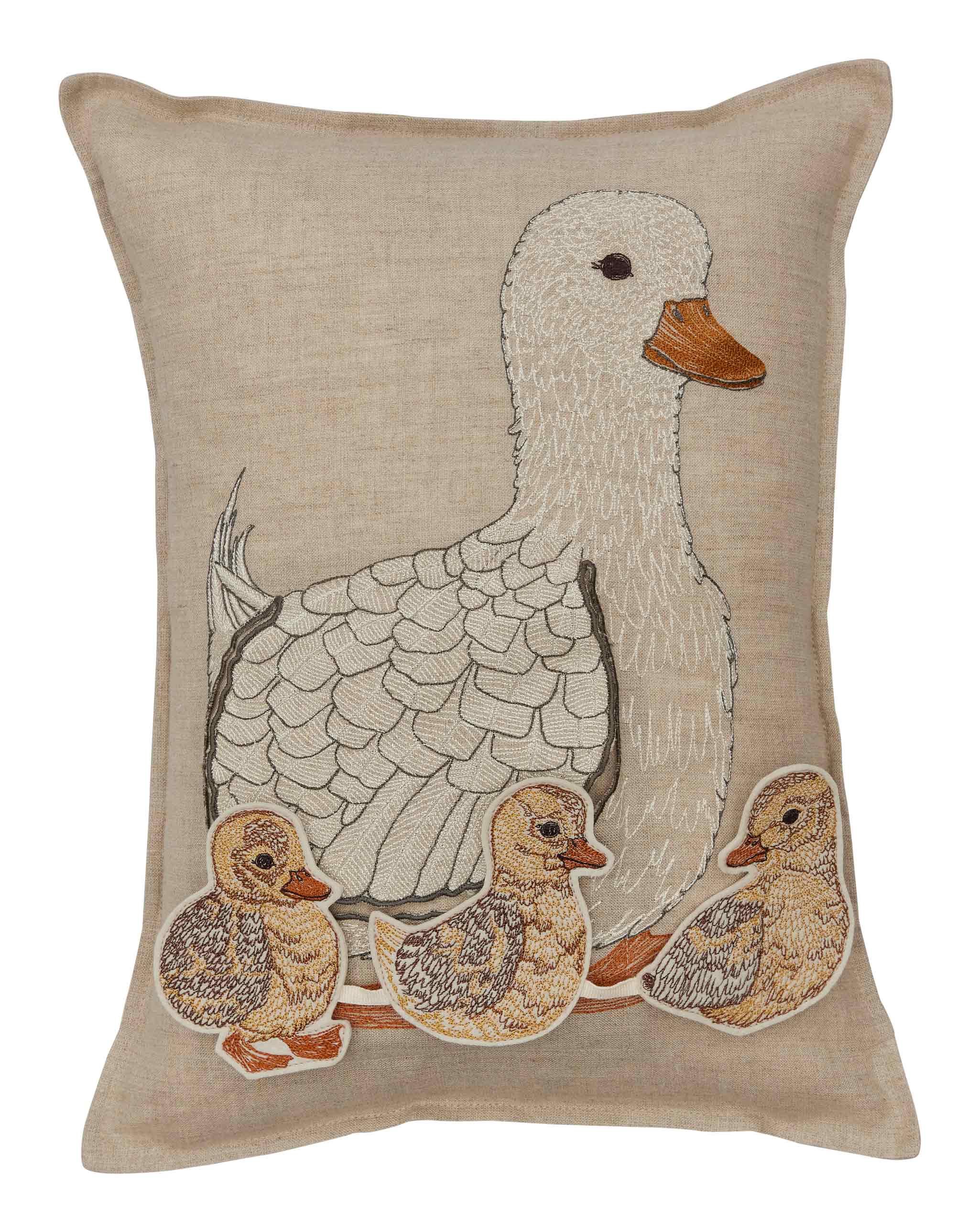 Measures 12" × 16" Mama Duck Pocket Pillow includes removable felt ducklings. Three removable ducklings are flat, embroidered on felt, attached together with cotton twill tape. Ducklings measure 10" × 4"