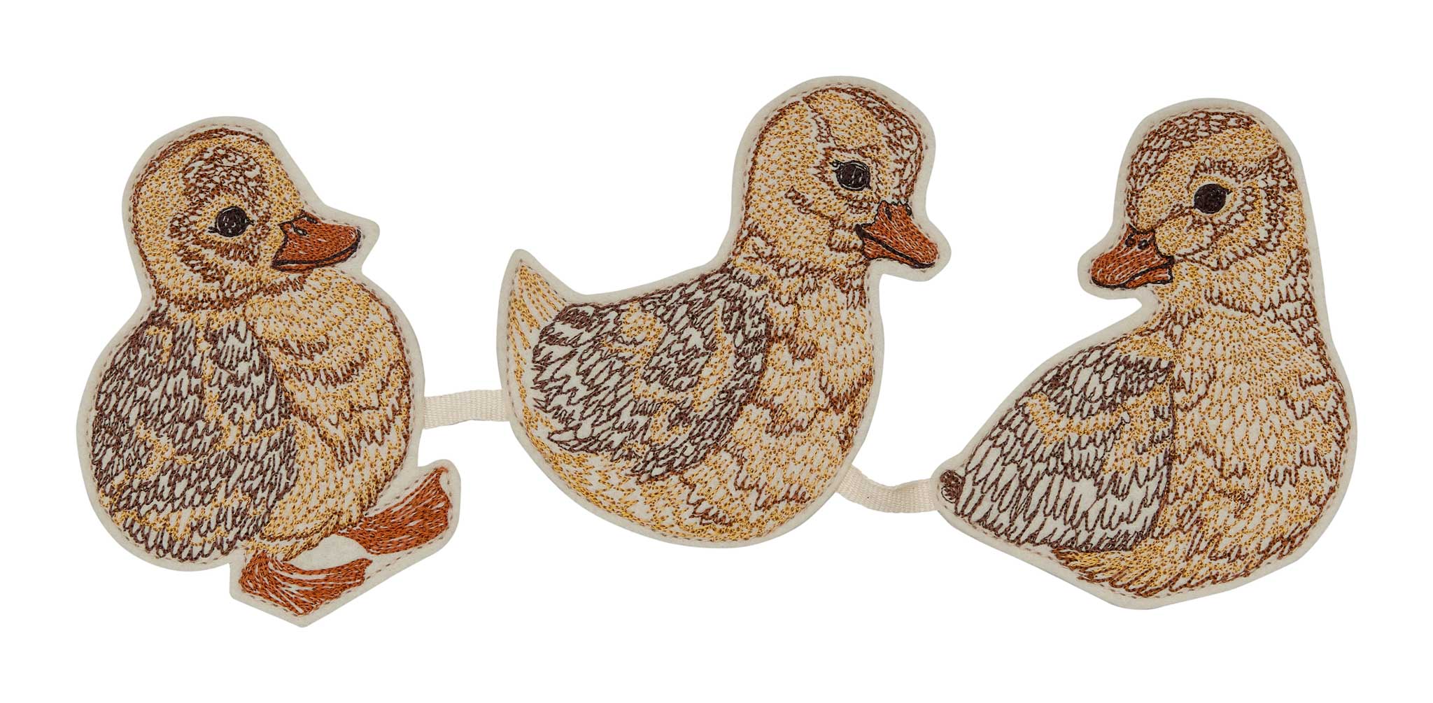 Mama Duck waddles along the river bank carrying very precious cargo. Lift up her wing to reveal a special surprise… three downy ducklings! The three ducklings are embroidered on felt and connected with cotton twill fabric. Remove the ducklings from under Mama Duck’s wing and enjoy the trio of baby ducks.