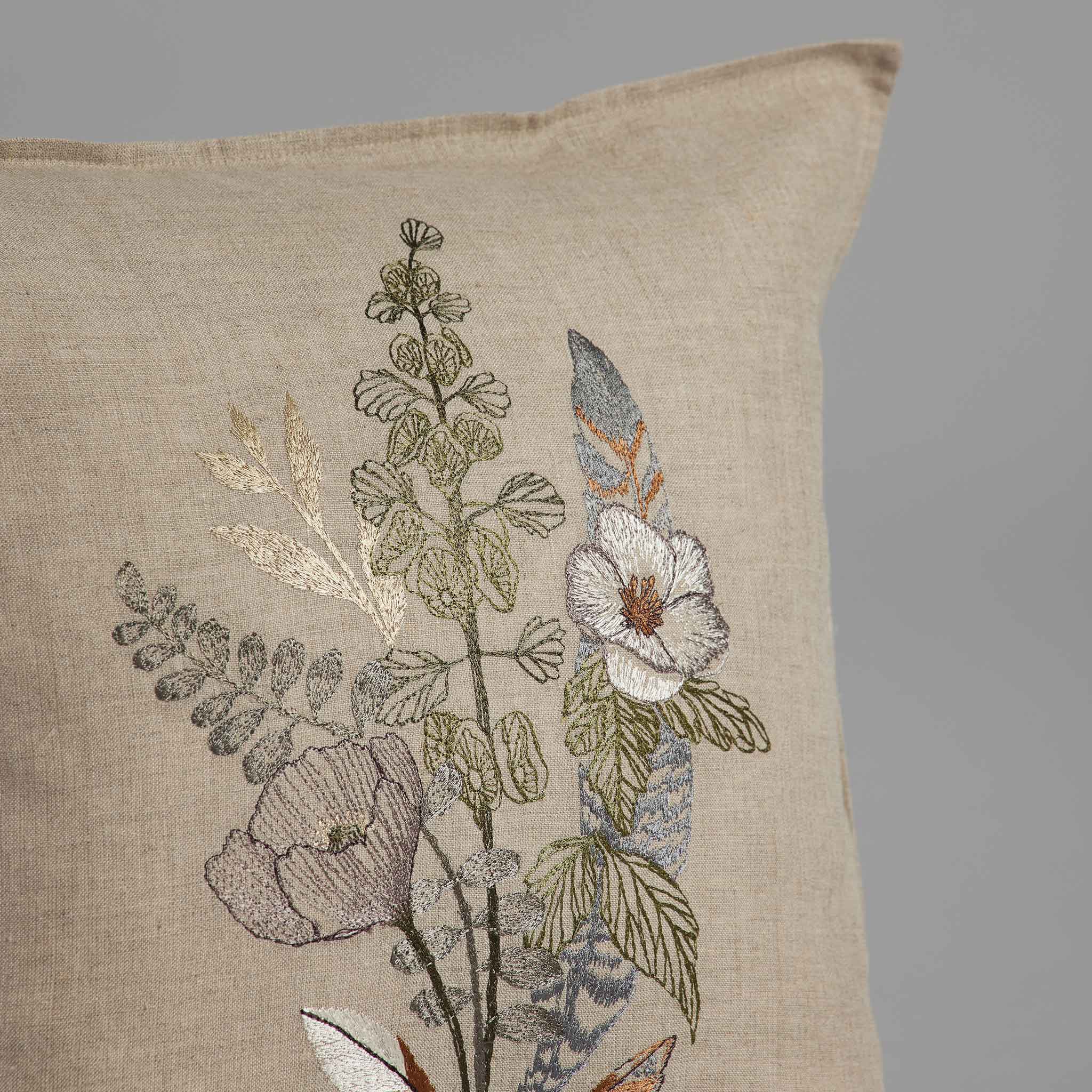 The botanical pillow features a combination of poppy flowers, greenery, and feathers for a charming display. Create a garden-like setting by pairing it with our Thistle pillow and Plants lumbar.