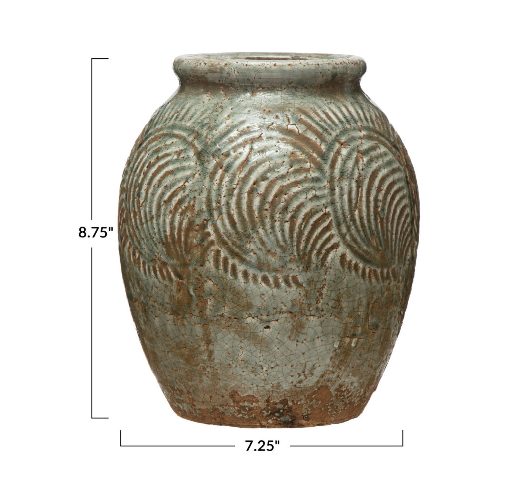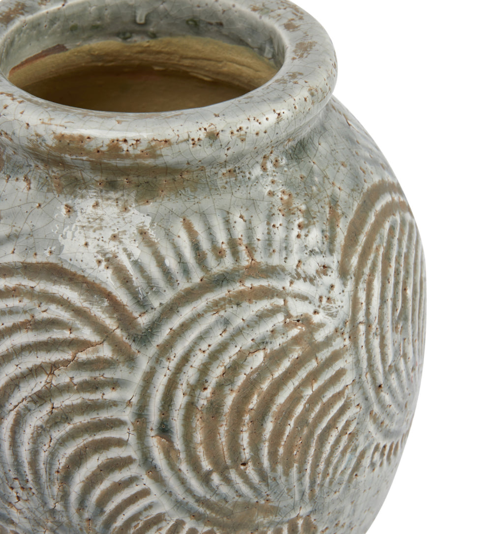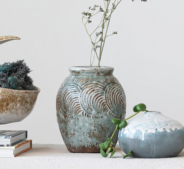 Vintage charm meets natural beauty in this blue grey terra-cotta embossed vase. This round vase features an embossed pattern that creates a lovely contrast with the grey color, which has a heavily distressed finish for a vintage look.
