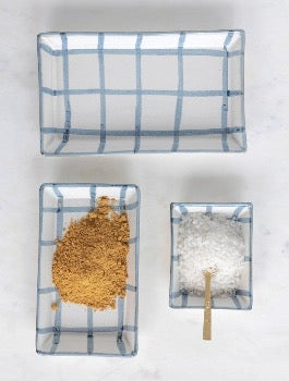 Each hand painted, these plates feature a blue and white plaid pattern with a unique reactive glaze finish. Please note, under the white and blue plaid pattern you do see a little of the brown clay base show through. The plates have a lovely rustic modern feel.