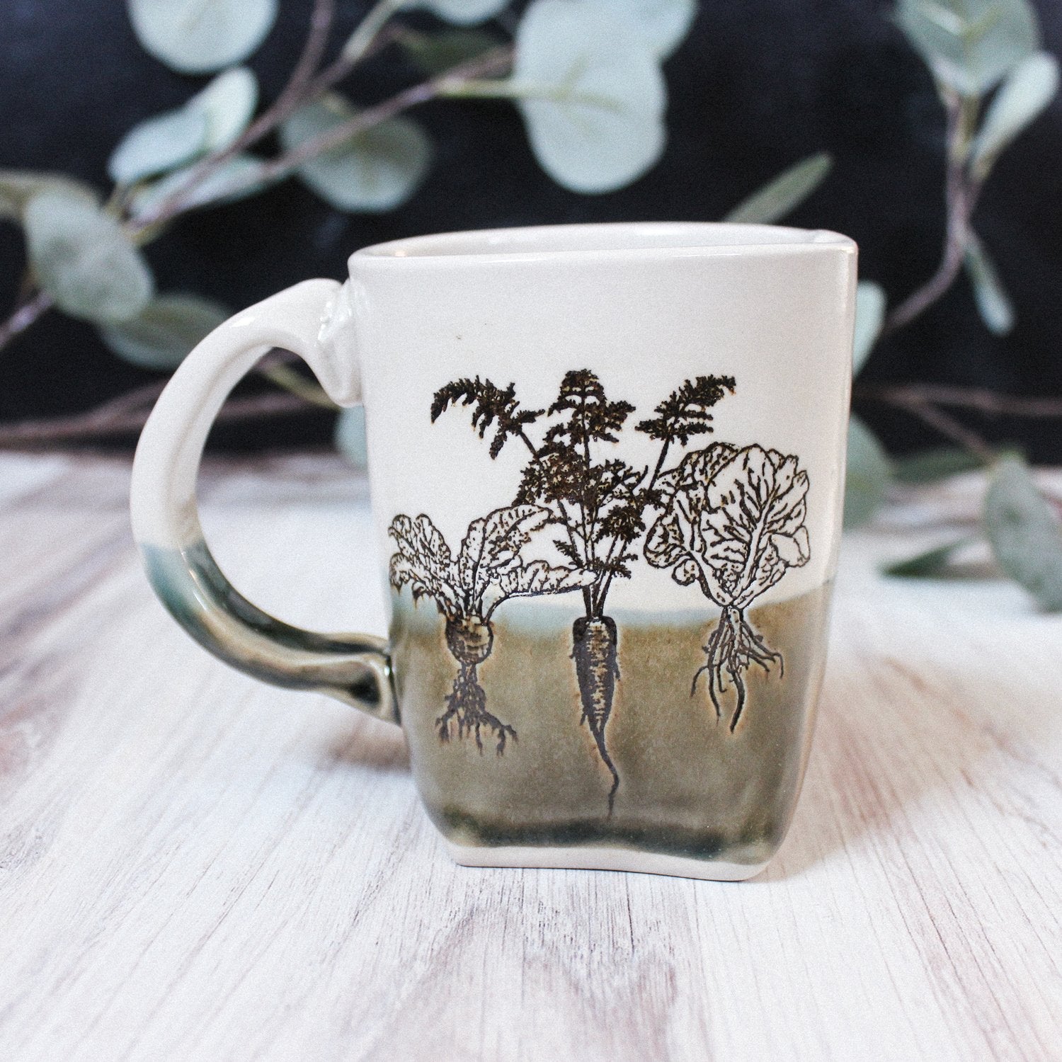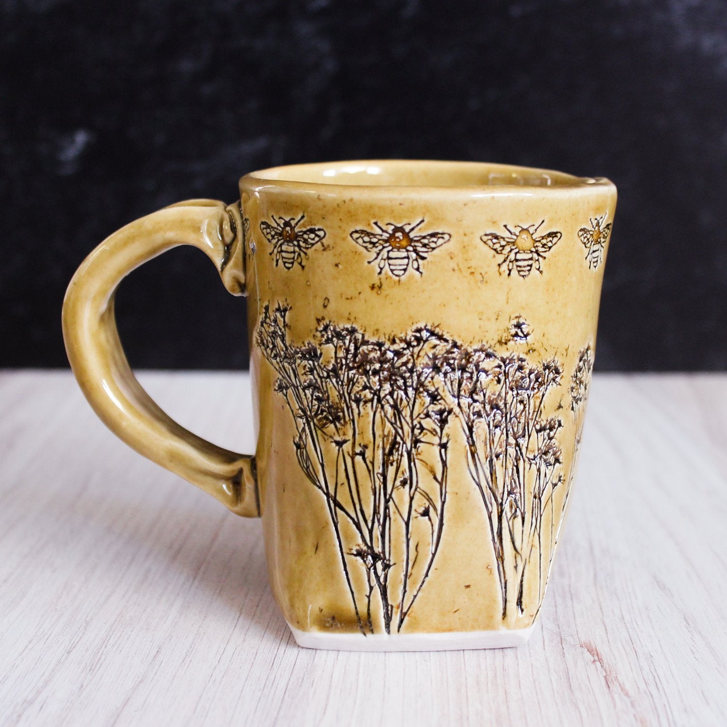 Each mug from Colleen Deiss Designs starts as a flat stoneware clay slab that’s pressed with one of a kind hand drawn stamps, real dried wild flowers, and/or real antique lace. Once formed by hand into their final shape they are bisque fired. They are then rubbed with stains to make the impressions pop and dipped in hand mixed glazes. Each one is high fired in rural Wisconsin out of her home studio.