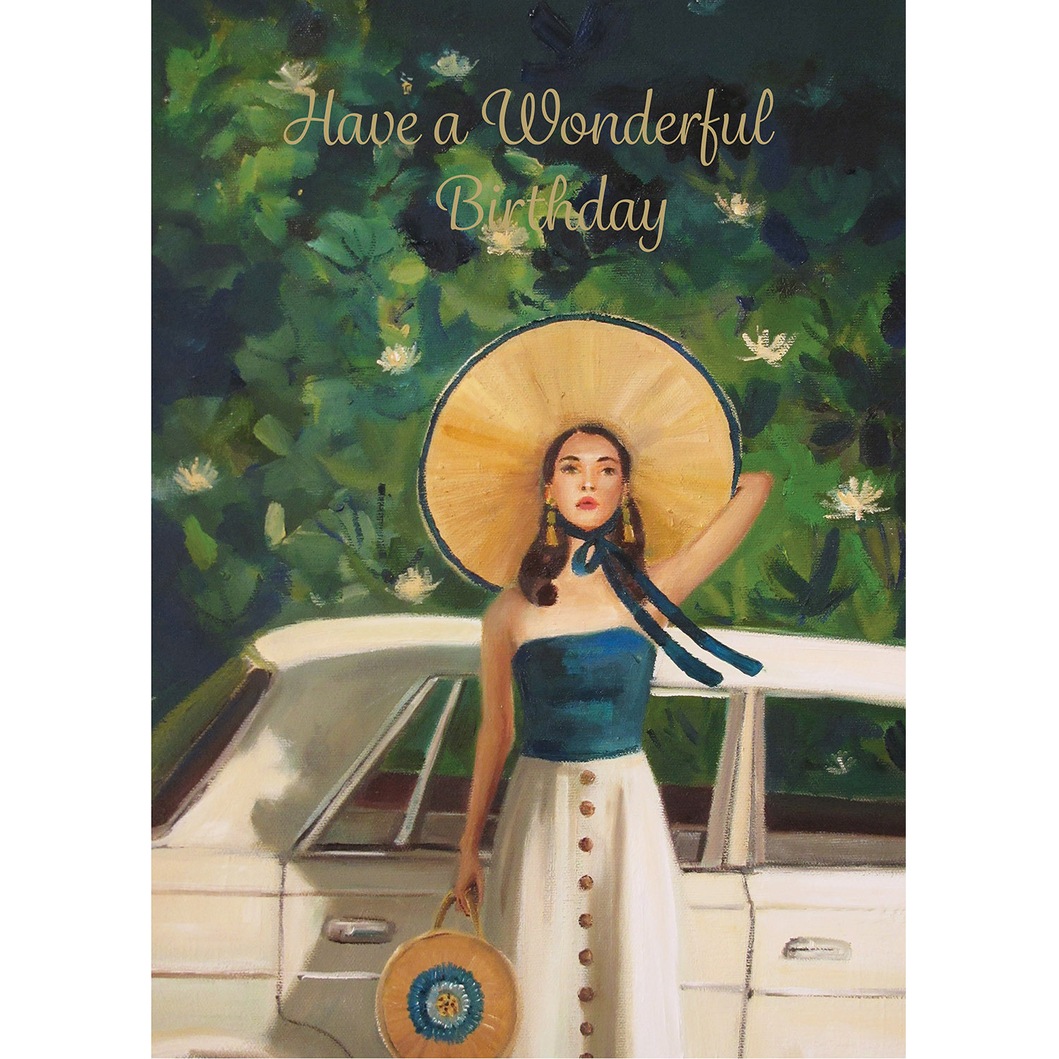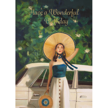 Send happy birthday wishes with this 5" x 7" greeting card by artist Janet Hill. Experience the whimsical worlds of Janet Hill's art in our collection of greeting cards for many occasions. Designed and printed in the USA on FSC certified, recycled content. Custom printed envelope included. Blank inside. Includes gold foiled message.