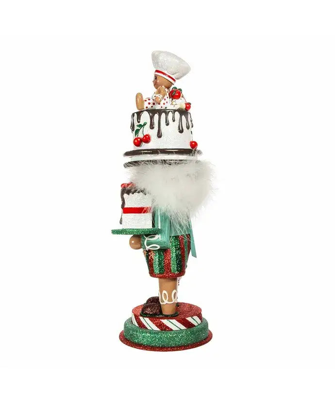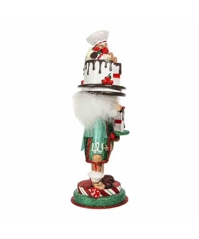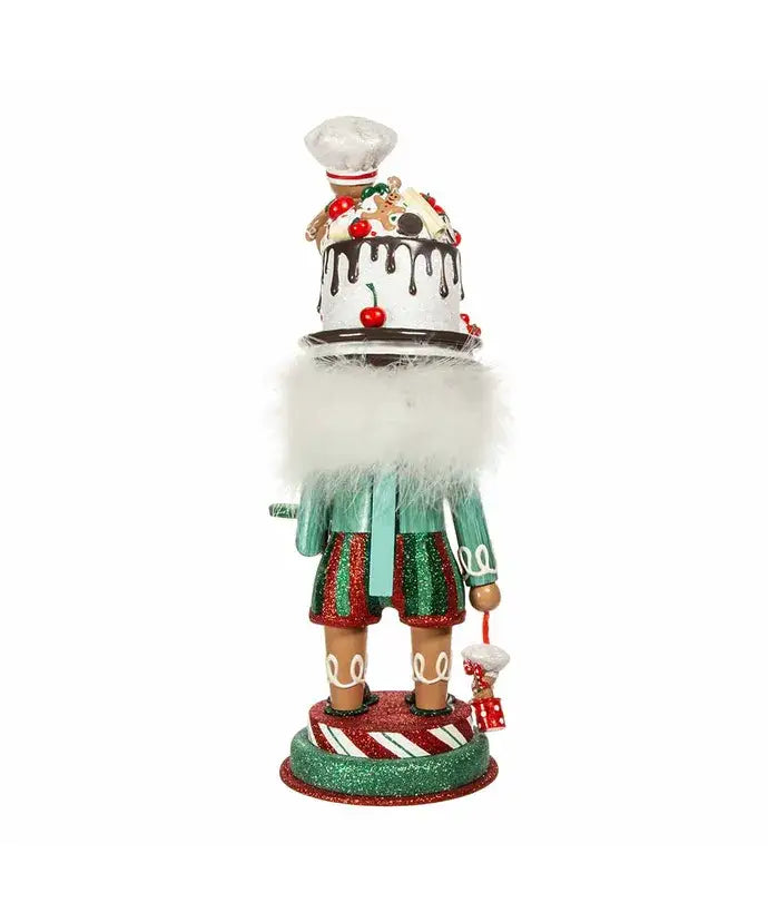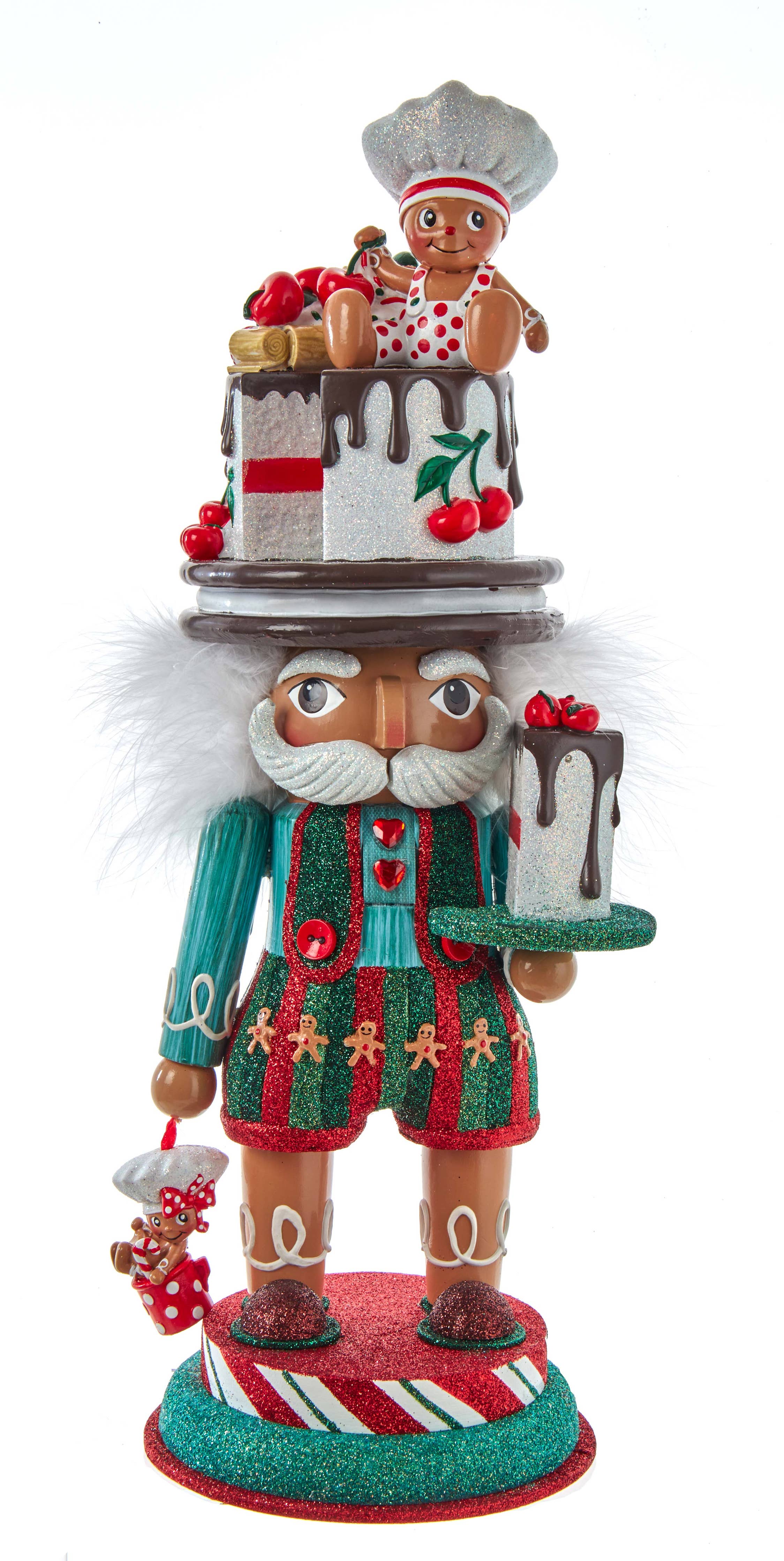 Hollywood Nutcrackers™ is a whimsical collection of nutcrackers created exclusively for Kurt S. Adler, Inc. and features an assortment of designs that put a unique, vibrant, memorable twist on traditional nutcrackers. This 15-inch nutcracker features a red and green glittered gingerbread baker with a glittered cake hat decorated with a miniature gingerbread chef and cherries, while standing on a red, white and green glittered base. In one hand he is holding a glittered cake and in the other he is holding a miniature gingerbread man.