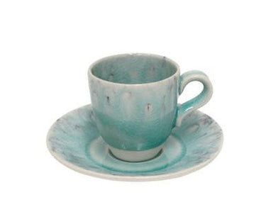 The Coffee Cup and Saucer, handcrafted in Portugal from fine stoneware, features a nature-inspired design with a crackled surface that mimics the effect of dappled lighting. Its vibrant color and unique glaze make it a striking addition to any table setting, perfect for both special occasions and everyday use.
