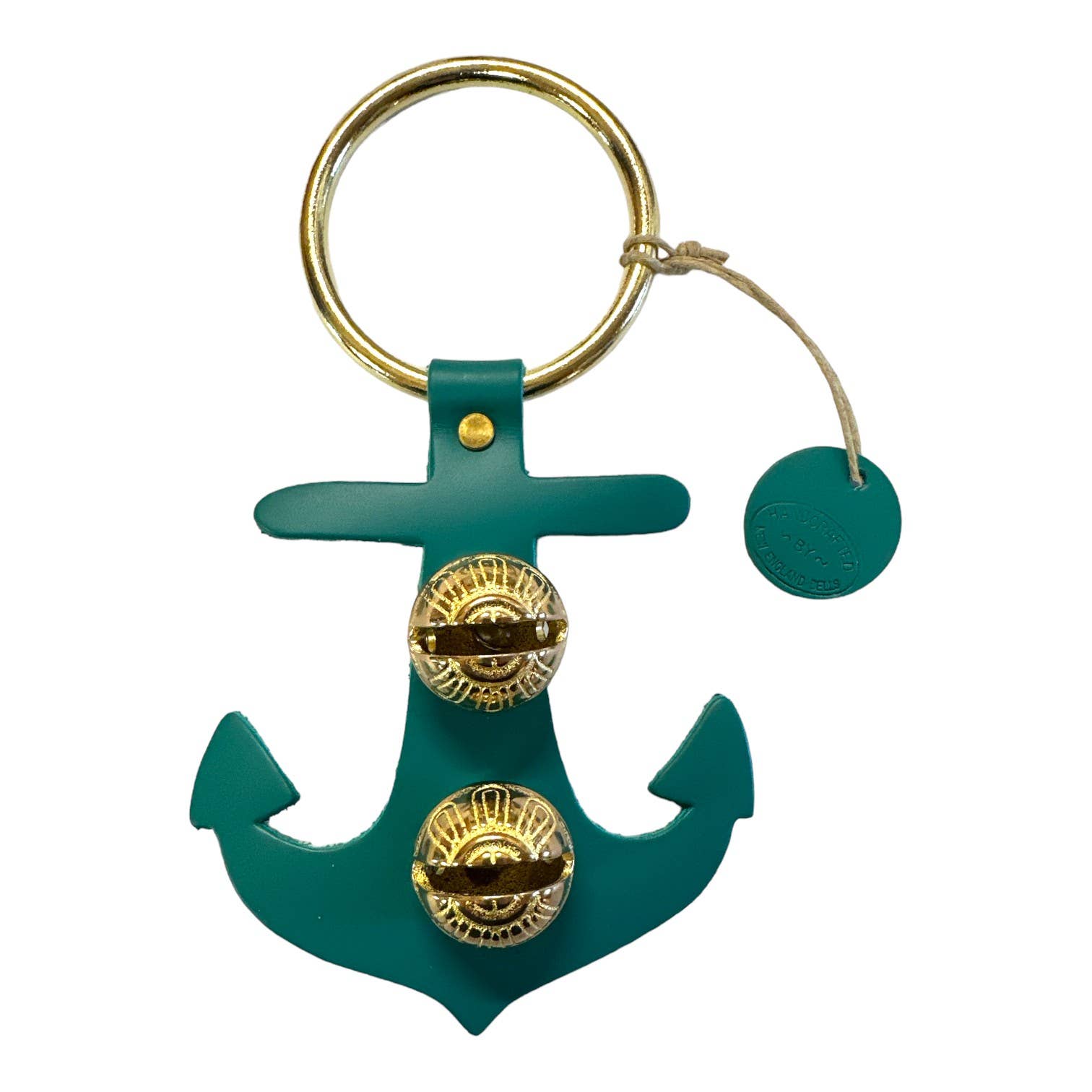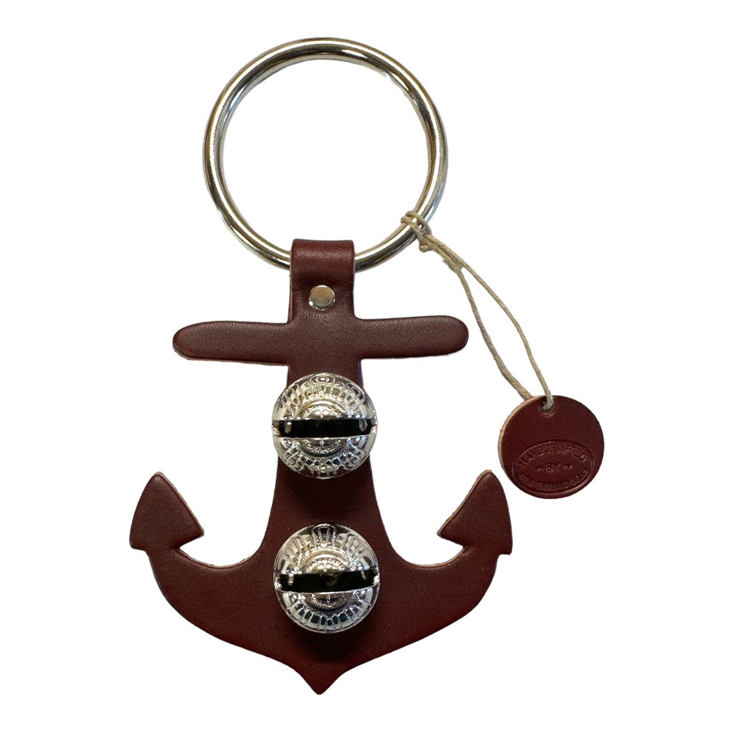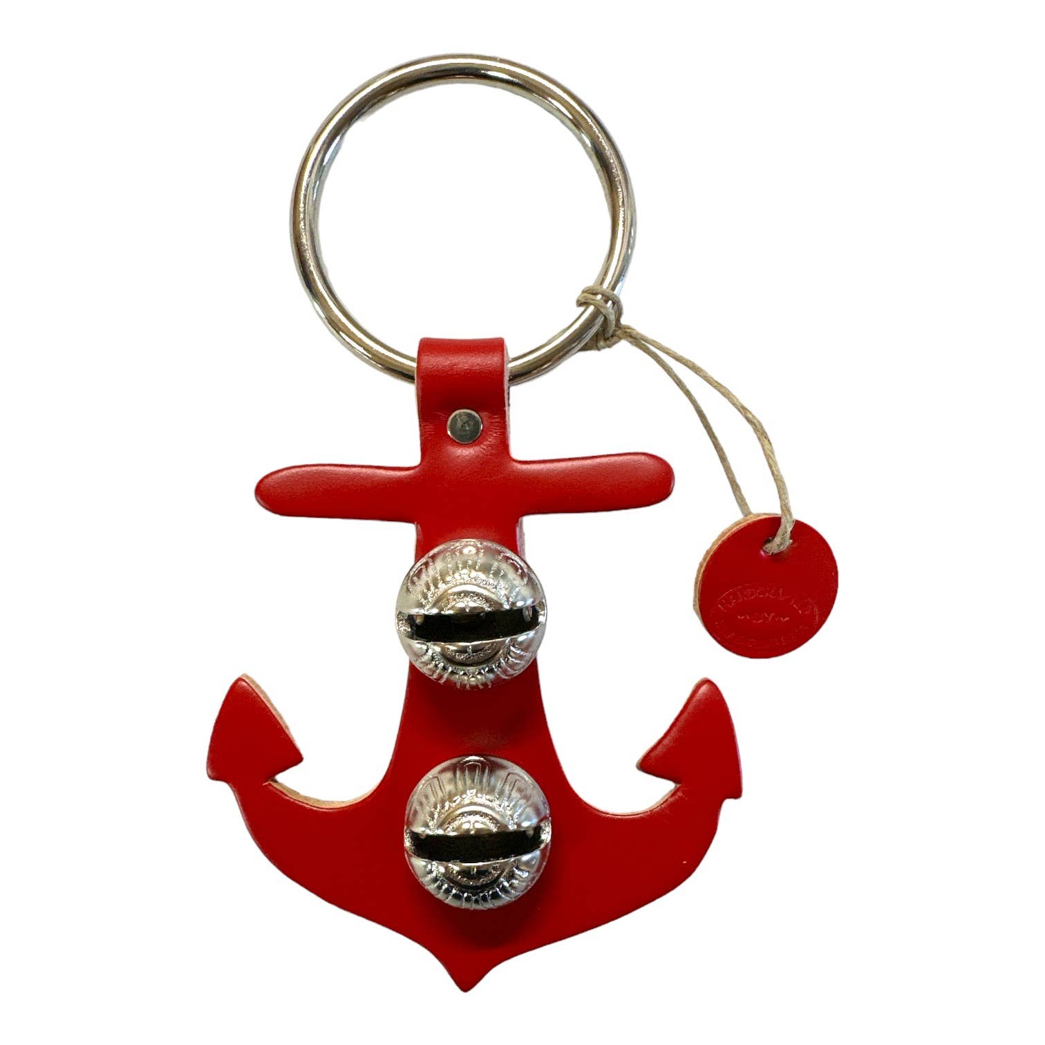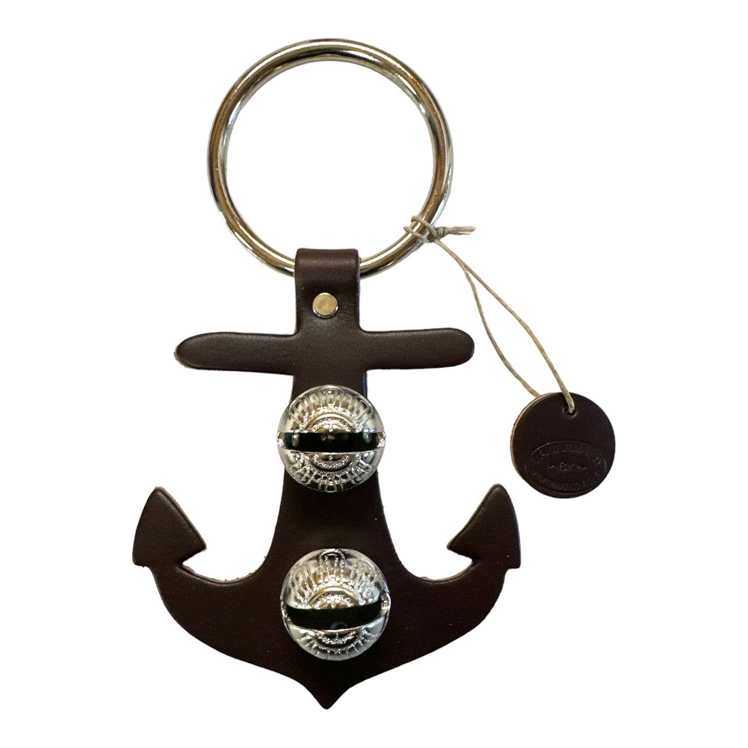 Each of these creations is stamped out of authentic leather. We then use an old-fashioned, foot-powered, riveter to attach the 2 1/2” ring. After the ring is attached, we add two of the popular #1 bells, with easy-to-remove, patented design pins, for quick cleansing. Each product has a hand-punched and stamped leather tag affixed to the ring. Average size: 7” x 6”.