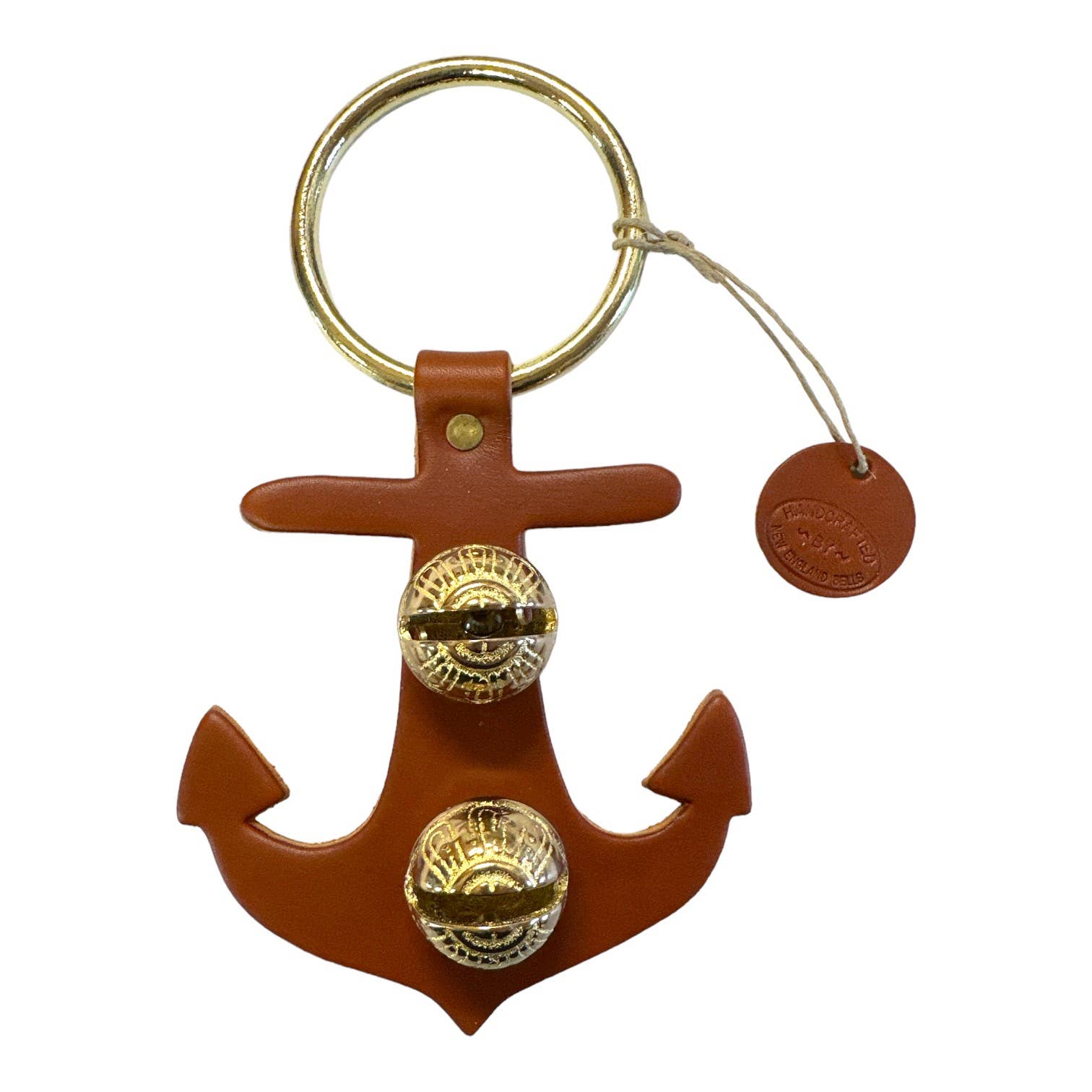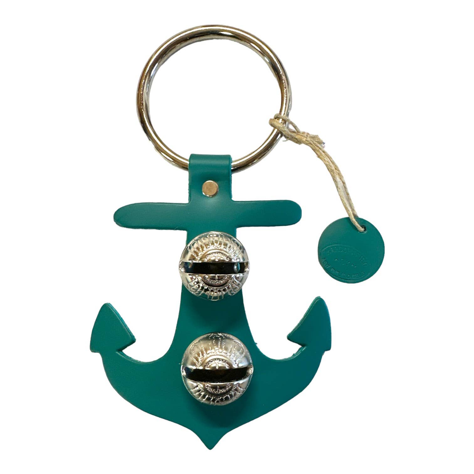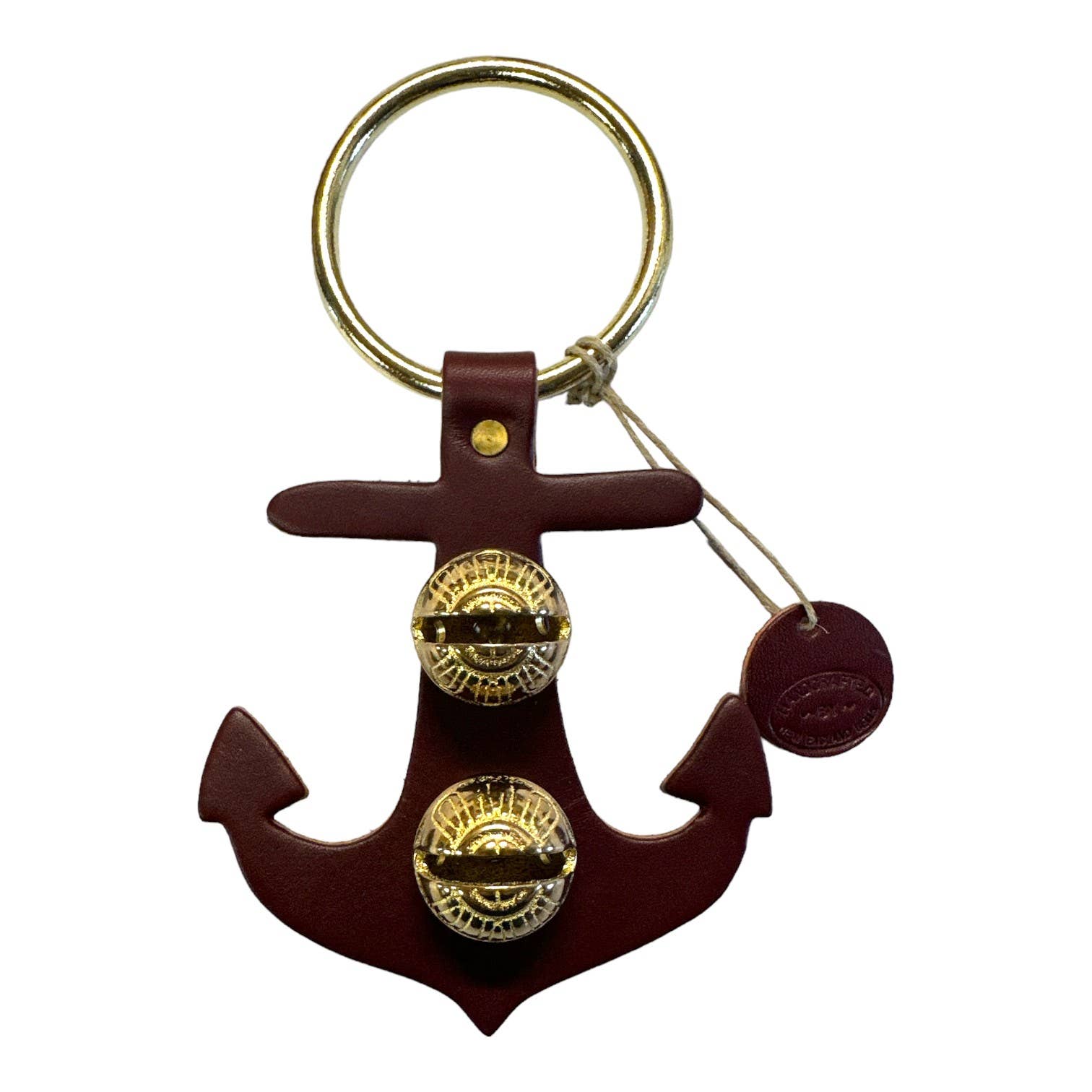 Each of these creations is stamped out of authentic leather. We then use an old-fashioned, foot-powered, riveter to attach the 2 1/2” ring. After the ring is attached, we add two of the popular #1 bells, with easy-to-remove, patented design pins, for quick cleansing. Each product has a hand-punched and stamped leather tag affixed to the ring. Average size: 7” x 6”.