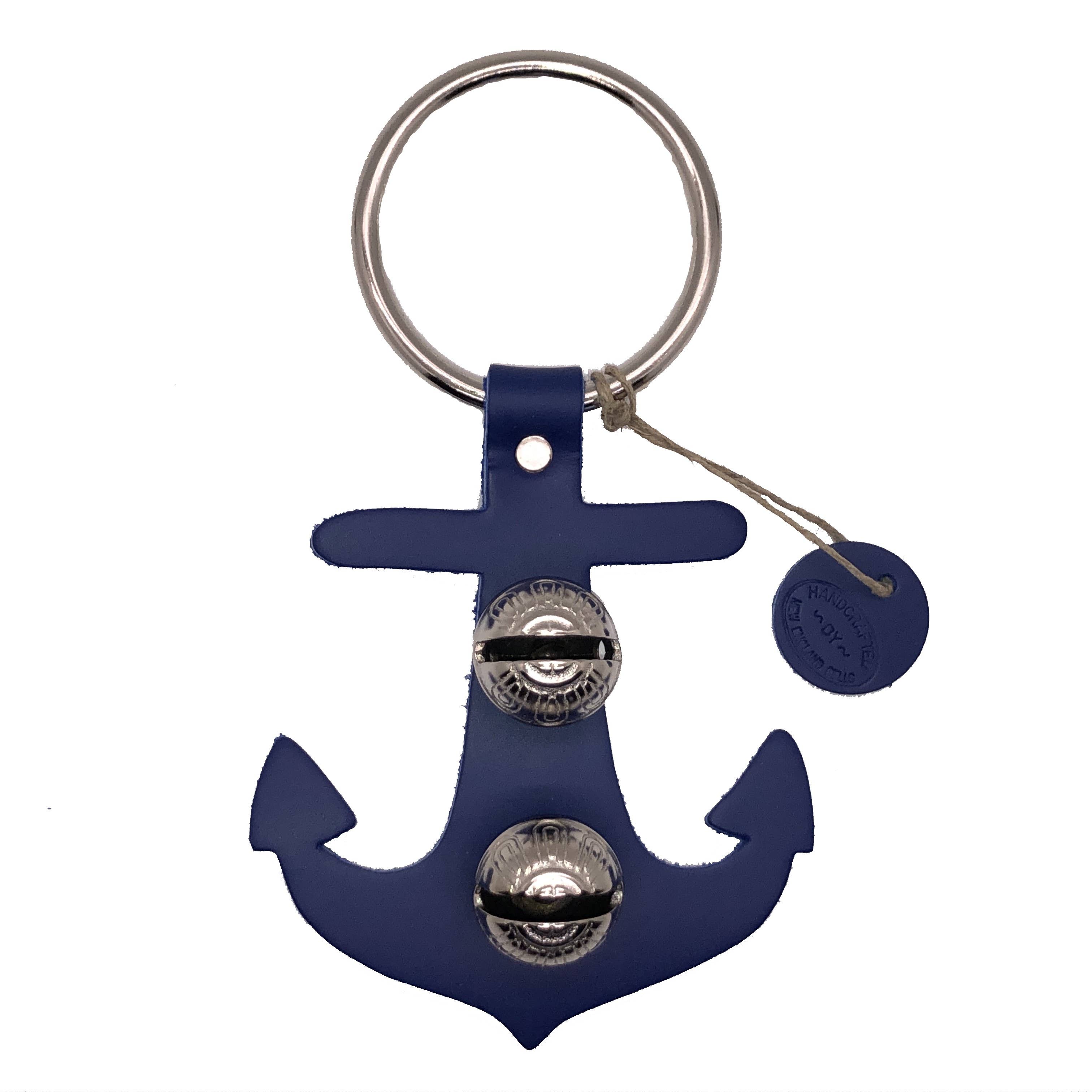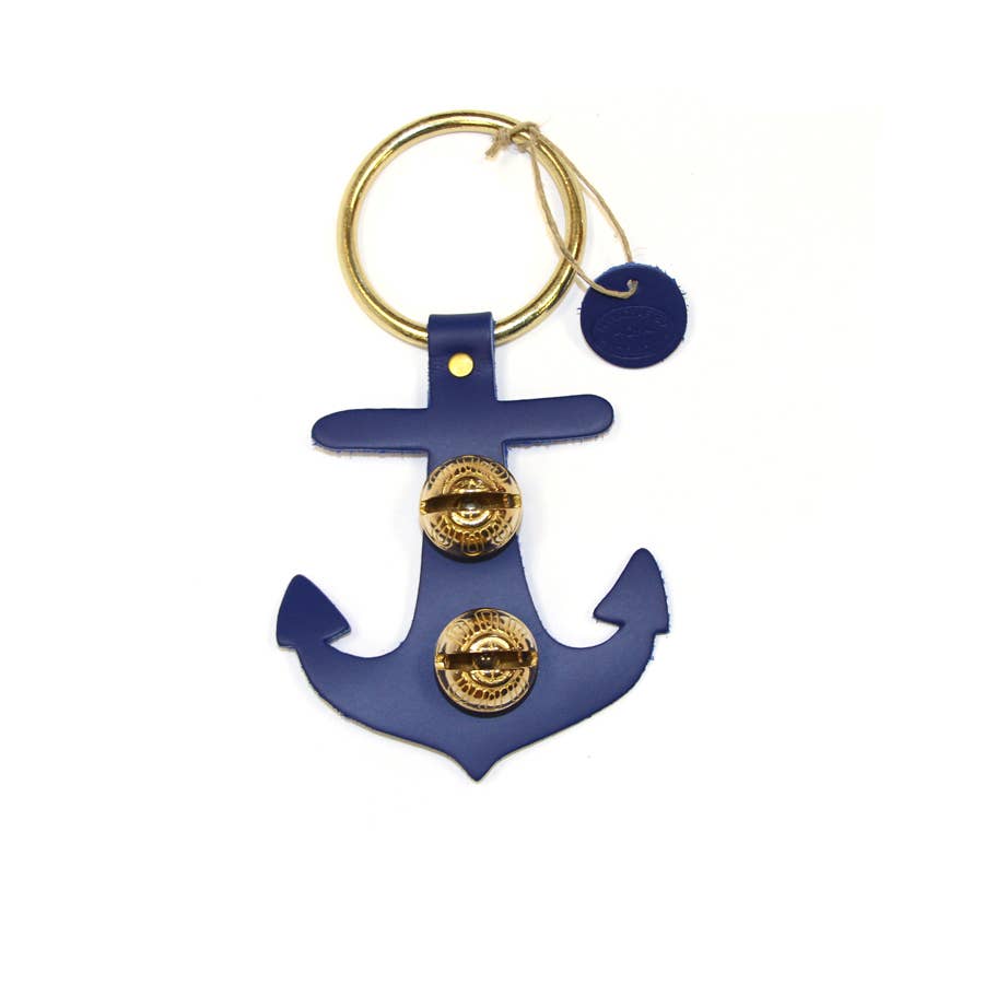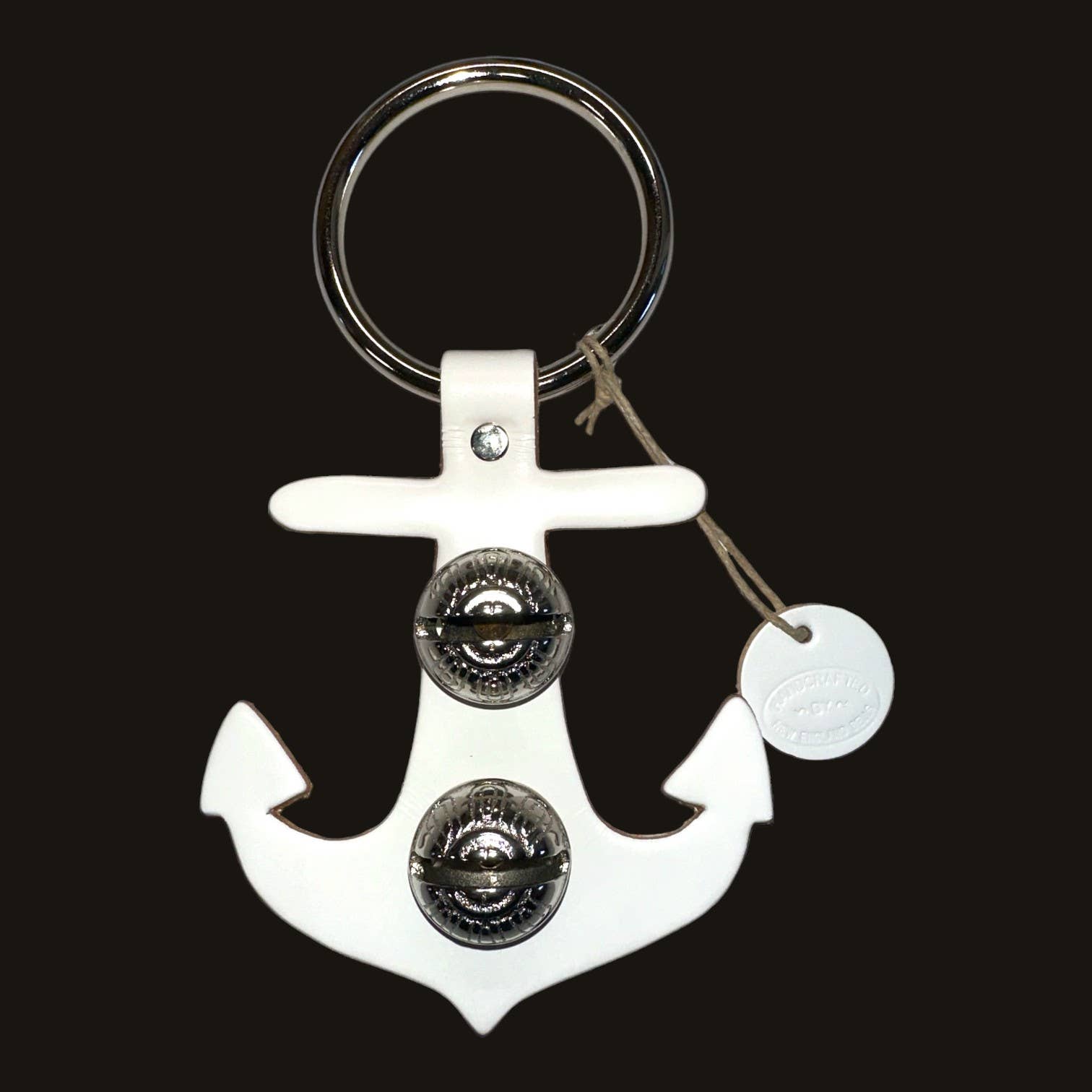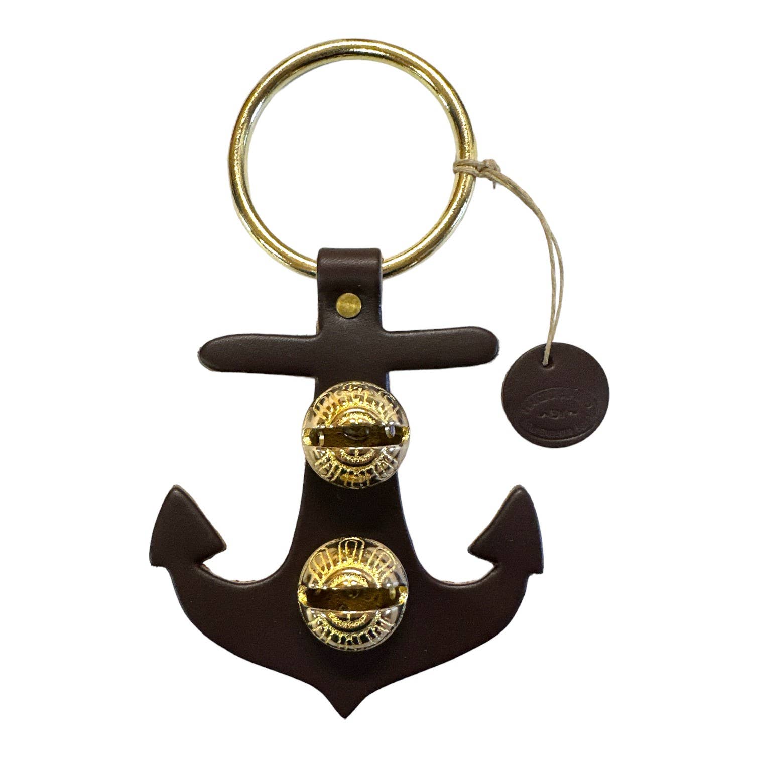 Each of these creations is stamped out of authentic leather. We then use an old-fashioned, foot-powered, riveter to attach the 2 1/2” ring. After the ring is attached, we add two of the popular #1 bells, with easy-to-remove, patented design pins, for quick cleansing. Each product has a hand-punched and stamped leather tag affixed to the ring. Average size: 7” x 6”.