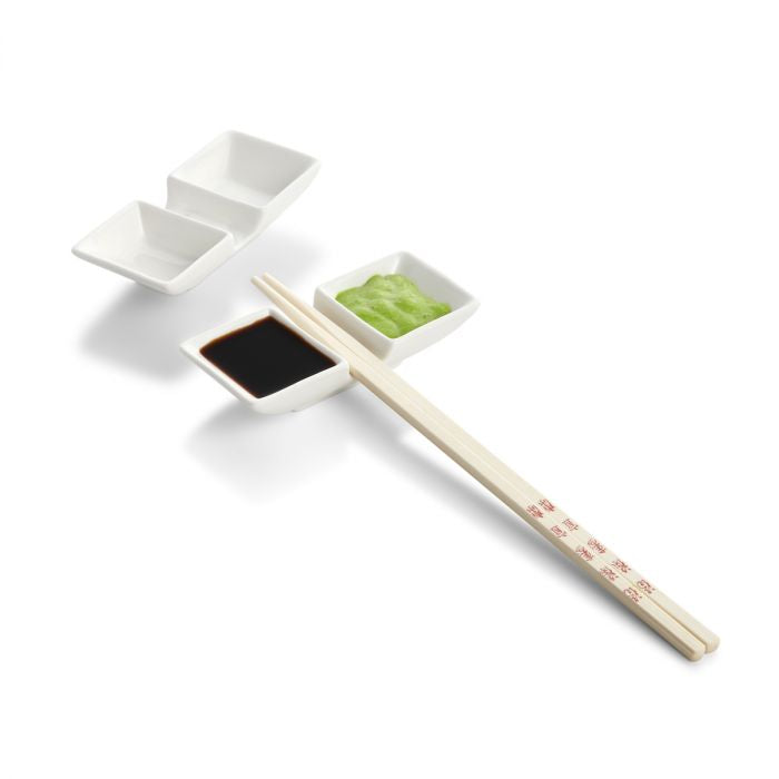 - Helen's Asian Kitchen 2-Section Sauce Dishes with Chopstick Rest serve sauces and pairings, and hold chopsticks between bites to keep tables clean
