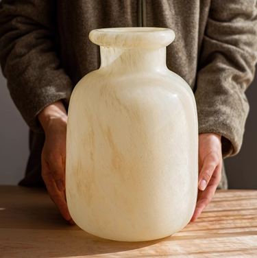 A handmade product, the Large Matte Frosted Glass Vase, boasts dimensions of 5.19" W (top) x 8.8" W (bottom) x 12.6" H and weighs 7 lbs. Made with precision from white/light yellow glass, this vase is unique in its color and shape.