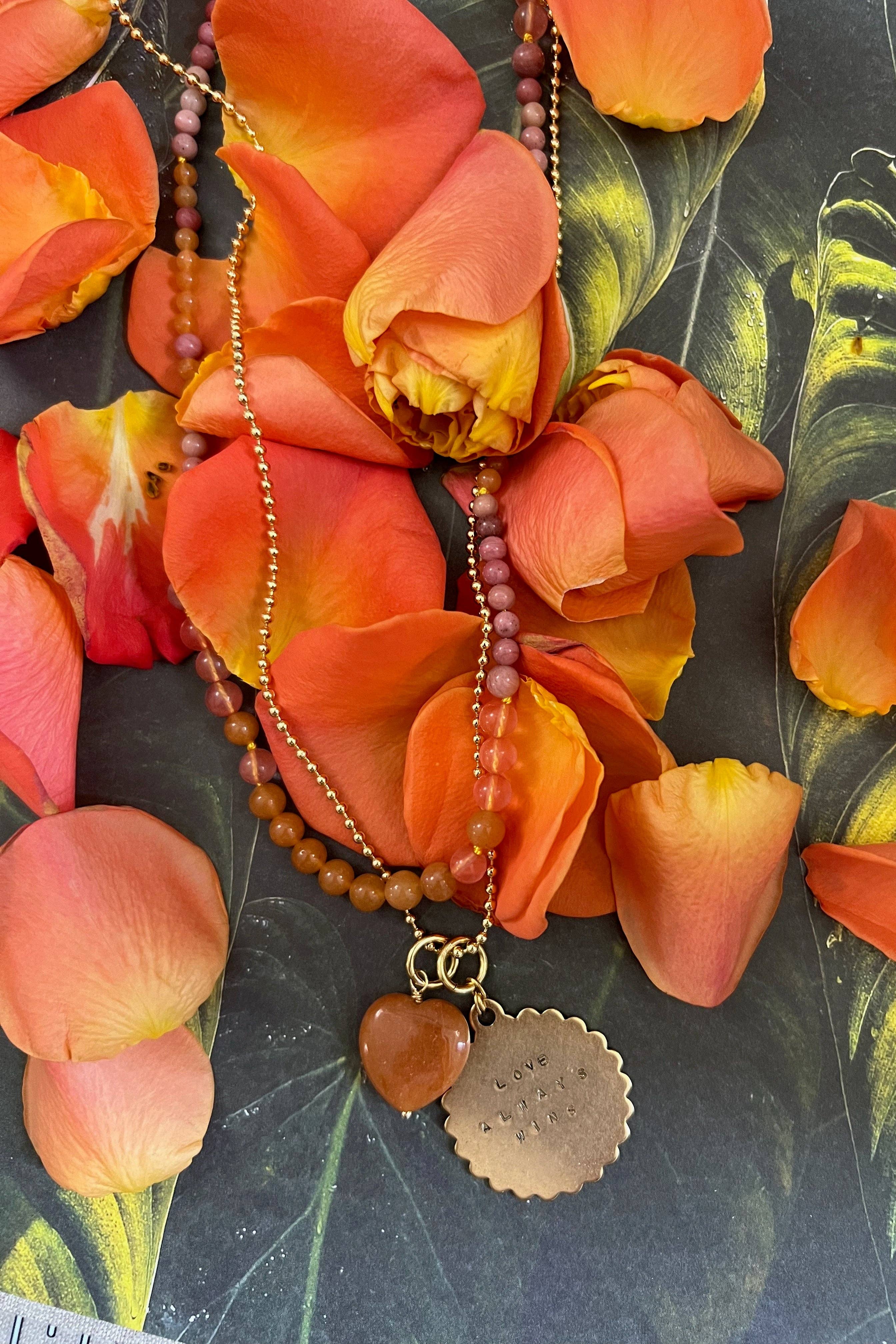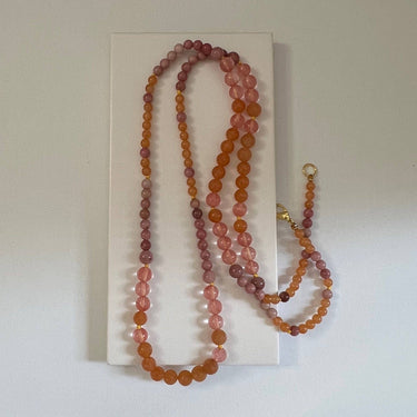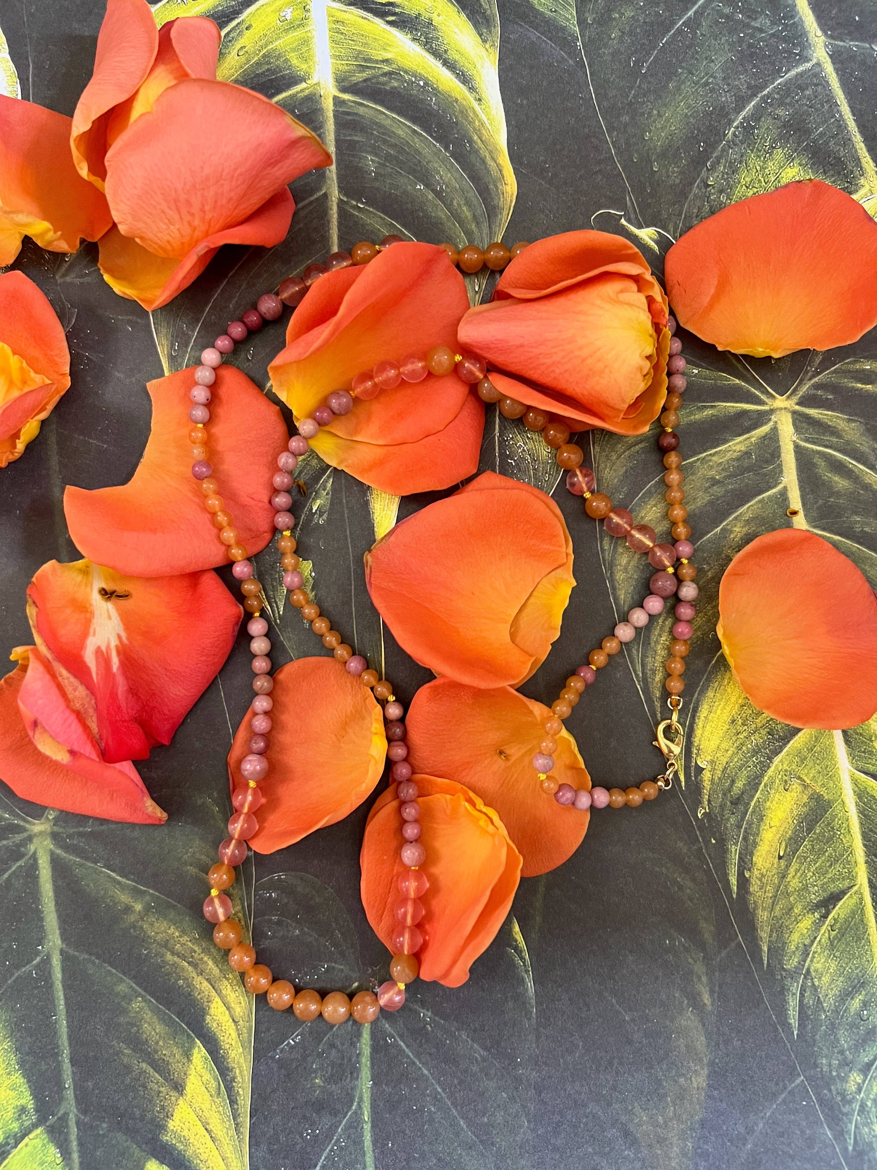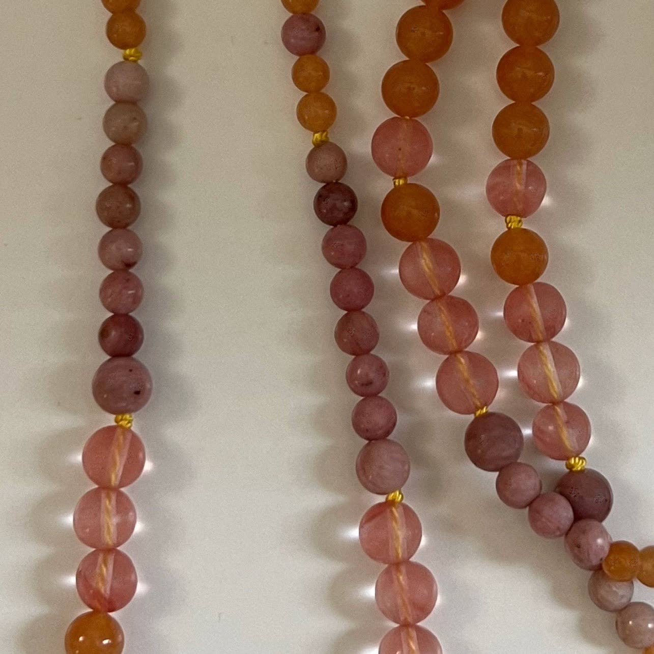 This necklace features hand-knotted red aventurine, rhodonite, and cherry quartz—each with unique color variations—strung on silk thread. Measuring 30 inches in length, it is expertly crafted in NYC.