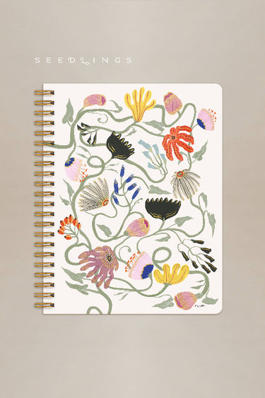 Seedlings BIG 8 1/2" x 11" hard cover notebook has got it all growin' on. Each layflat wirebound book is fully embellished with unique foil details on the front textured hard cover, has an inside pocket, 200 lined pages and a PLANTABLE seed paper band that is biodegradable and embedded with wildflower seeds. When the seed paper is planted in soil, the seeds grow and the paper composts away. All that is left behind are flowers.