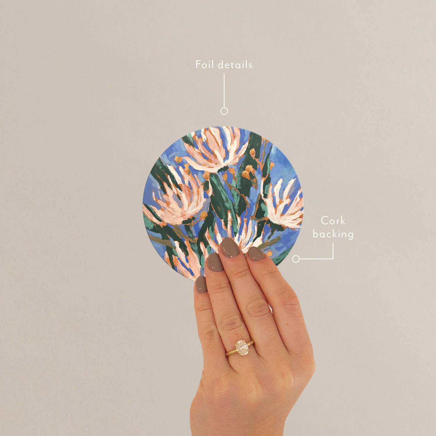 Our loose coasters feature hot foil stamped designs, which are corked-backed and heat + water resistant. Made in the U.S.A. Coaster Size: 3.75" x 3.75"