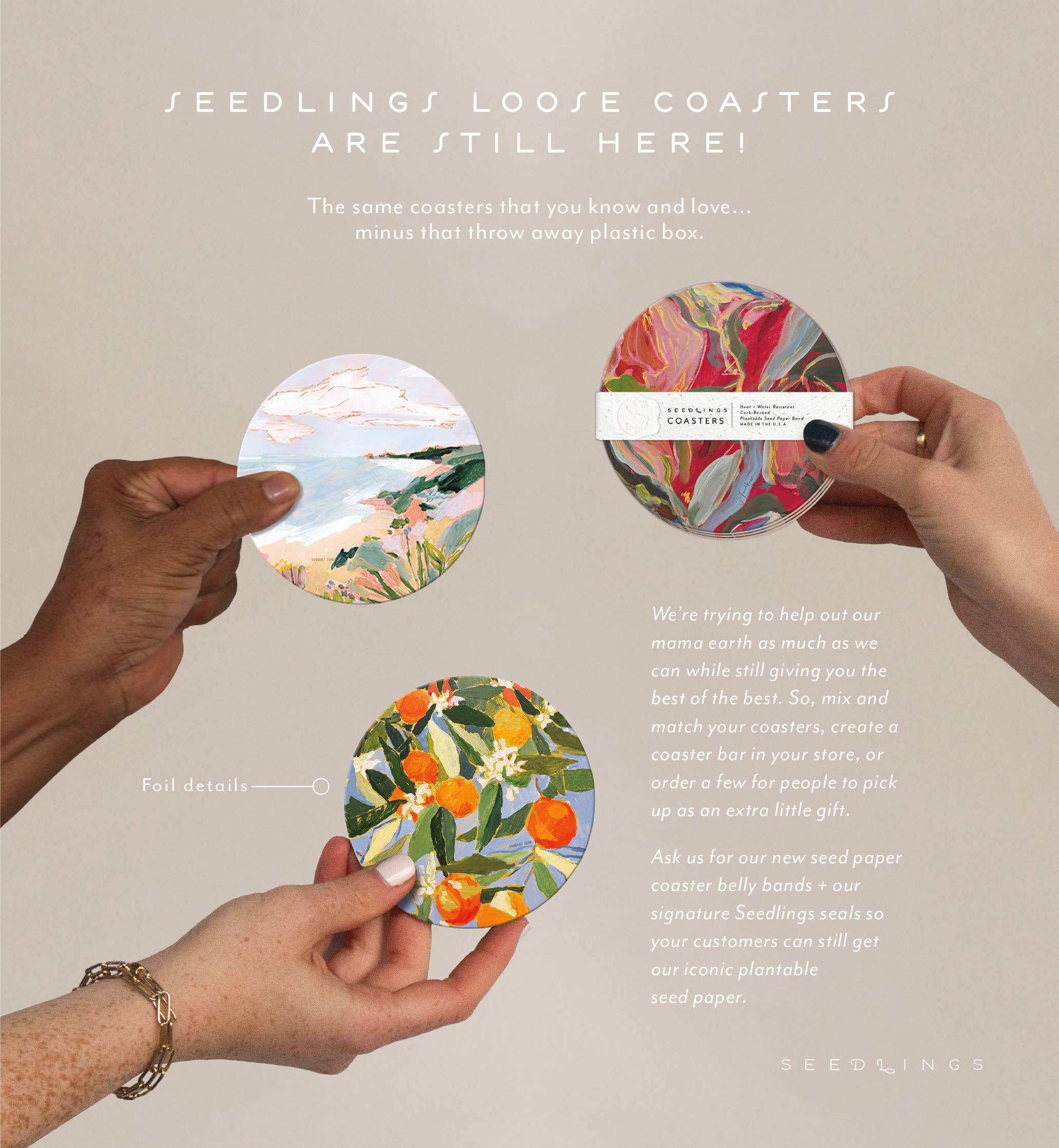 Our loose coasters feature hot foil stamped designs, which are corked-backed and heat + water resistant. Made in the U.S.A. Coaster Size: 3.75" x 3.75"