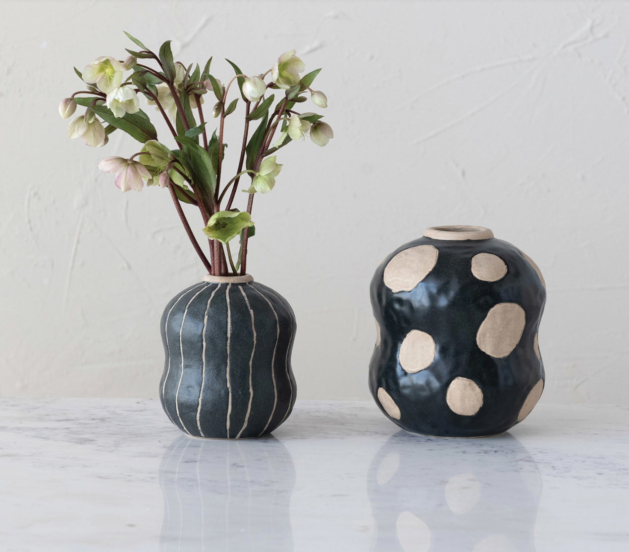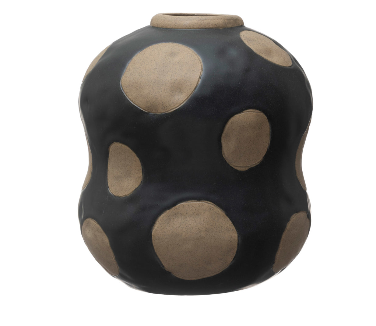 This stylish and eye-catching vase features wax relief dots that create a contrasting and textured pattern on the matte black and cream surface. The vase has a narrow opening that can hold a few stems of flowers or foliage, or be used as a standalone piece.