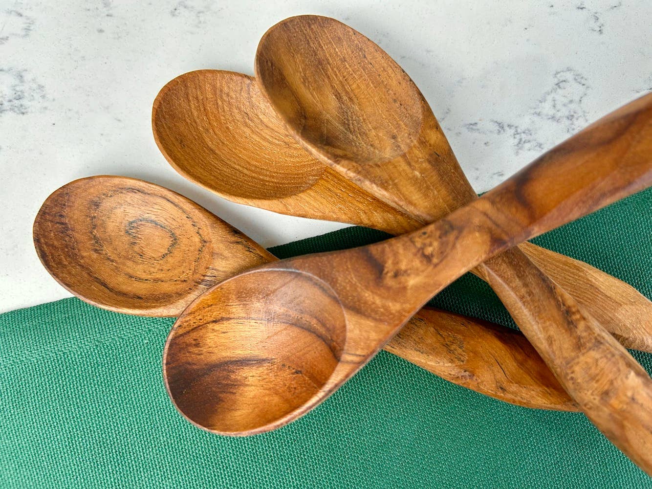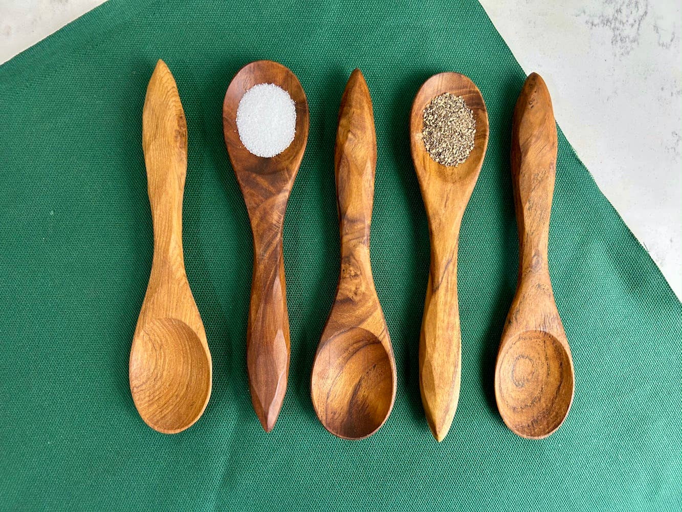 These charcuterie spoons are crafted from beautiful and durable Salvaged Teak Roots, making each one a unique piece. They measure approximately 7” long and are hand finished, giving each one a quality, sturdy feel when picked up. Their petite and delicate size makes them perfect for complementing charcuterie displays but also taste testing a meal, highlighting small appetizer bits, or assisting with serving favorite snacks. To help promote longevity and durability, the spoons are sealed with food-safe mineral oil and organic beeswax. They are easy to care for and a fresh take on today’s overuse of plastic. Just hand wash with mild soap and water and dry with a soft cloth. We’ve curated a collection of thoughtfully designed charcuterie and cooking utensils that when combined will make wonderful, practical, and beautiful additions to any kitchen. We also offer in-house engraving capabilities to add your logo or branding.