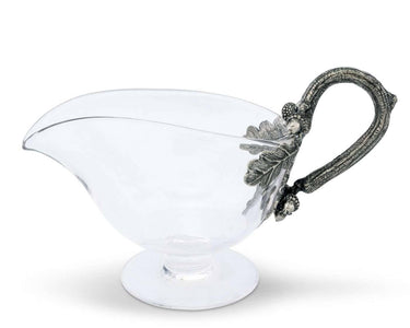 Classically footed and embellished with pewter, Vagabond House's Acorn Forest Gravy Boat makes a bold statement on any table. A thick, figural branch forms the piece's handle as it loops from the glass rim down towards the base. Exquisite acorns adorn each attachment point, while veiny leaves extend around the back portion of the design. Size: 9"L x 4"W x 6"H Care: Hand wash recommended - if placing in the dishwasher use low heat and non acidic detergent