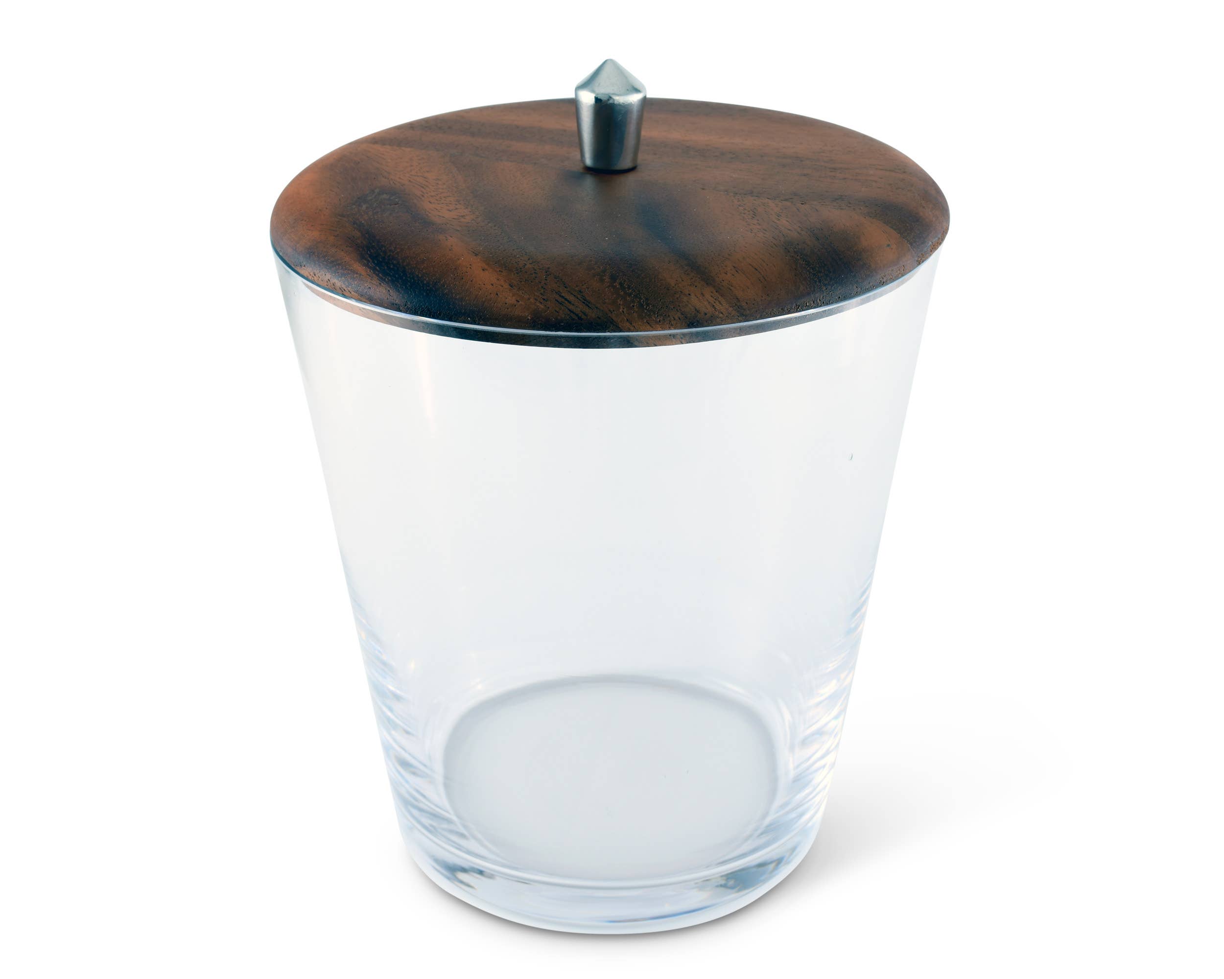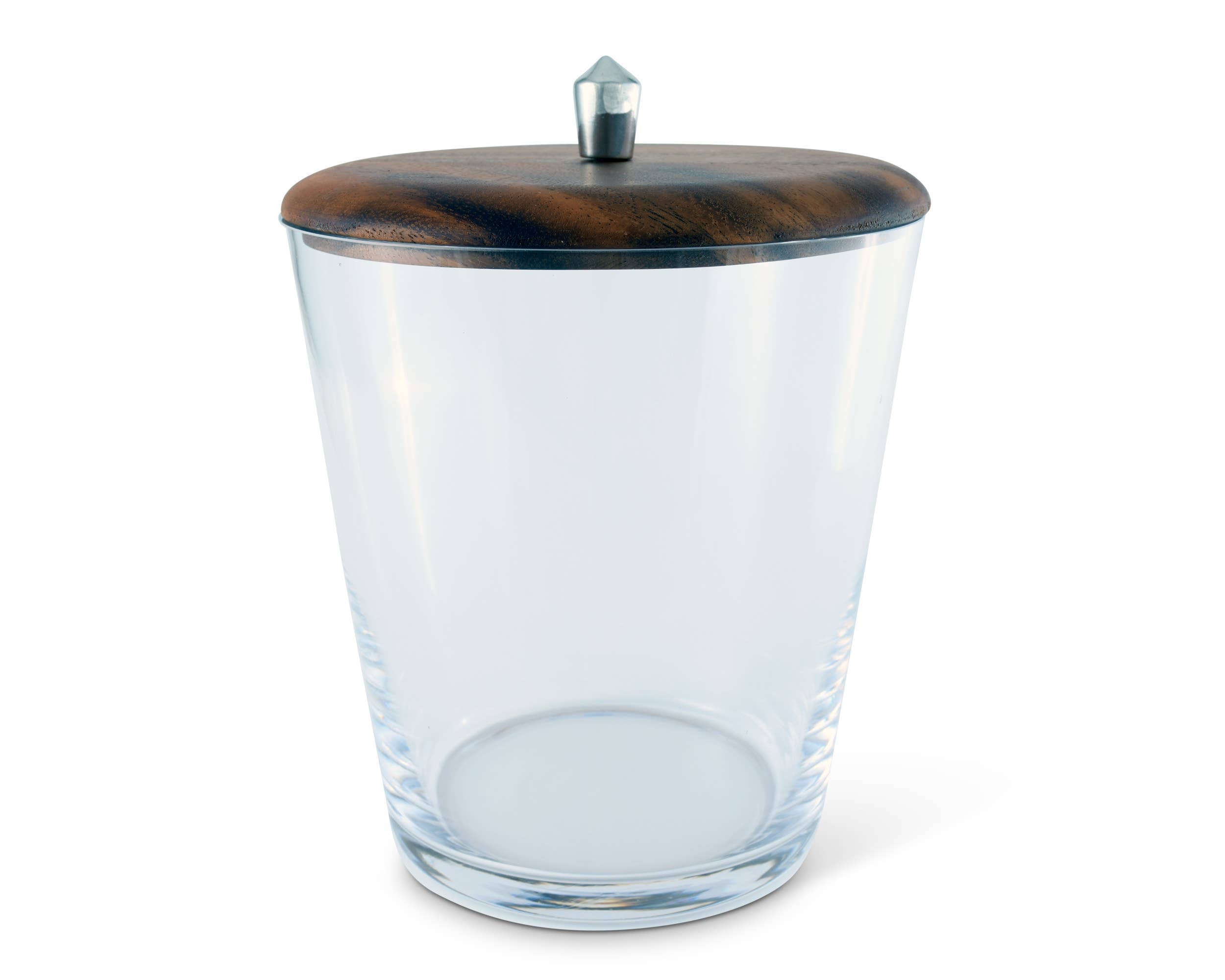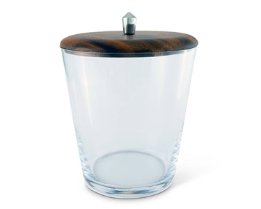 Clearly chic and stylish, Vagabond House's Tribeca Glass Ice Bucket pairs a thick bottom, heavy Italian glass bucket with a sleek modern lid. Striated Teak lid picks up different colors depending on the light, a pewter knob finial handle finishes the Mid-Century Modern design. Sleek and slightly sexy, Vagabond House's Tribeca Collection embodies urbane sophistication and mid-century modern style. Size: 8.25"T x 6.25"D Care: Hand wash and dry recommended; For Dishwasher use lowest heat settings and non-acidic detergent