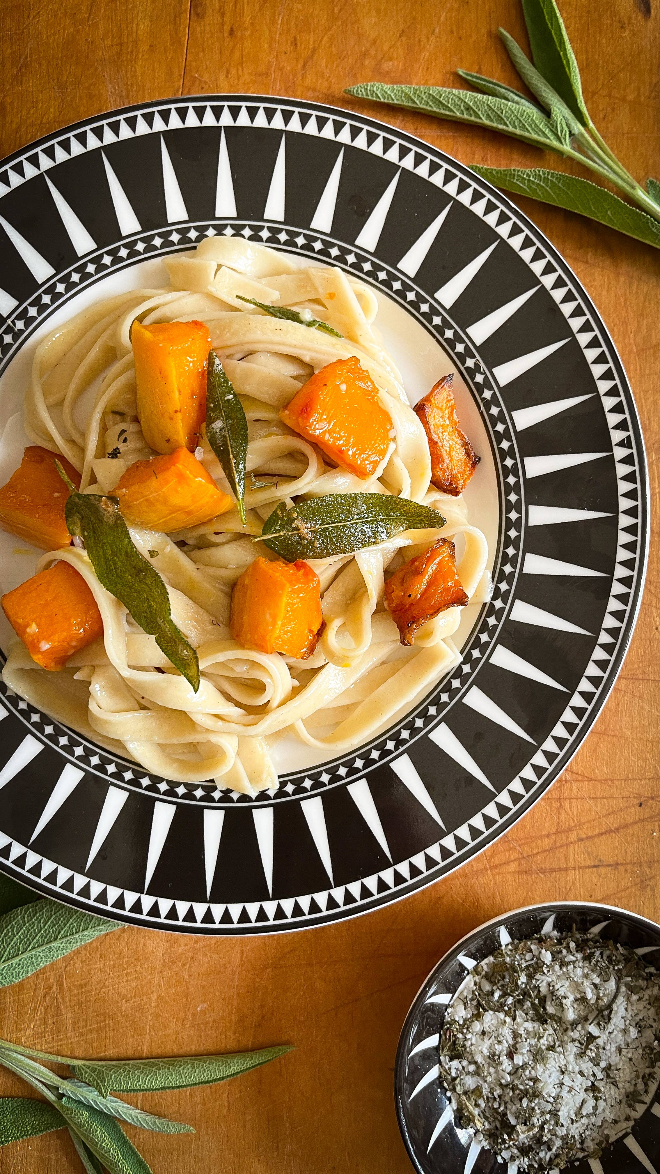 Our butternut squash pasta is creamy and sweet. It is the perfect pasta for sage butter but it is also great with Tuscan beans and kale pasta.