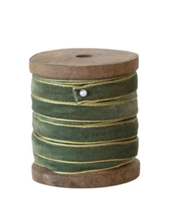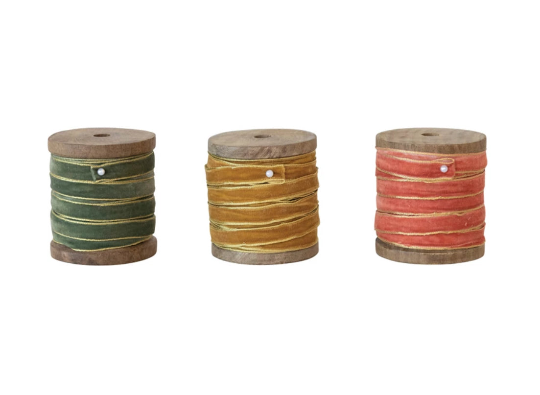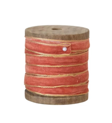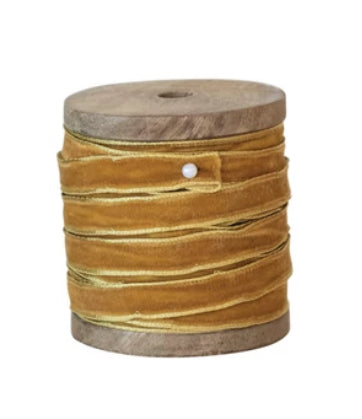 Luxe velvet ribbon with a metallic gold edge on wooden spools in a warm coral, rich ochre, or lush green, add depth and variety to your ribbon collection. Suitable for wrapping gifts, making bows, decorating cards, or embellishing home accessories.