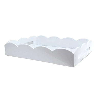 Designed to sit beautifully on any coffee table, ottoman, or sideboard this glossy, white lacquer tray boasts a playful scalloped edge and deep straight sides. A must-have for any home this piece functions wonderfully as a drinks tray or for enjoying breakfast in bed.
